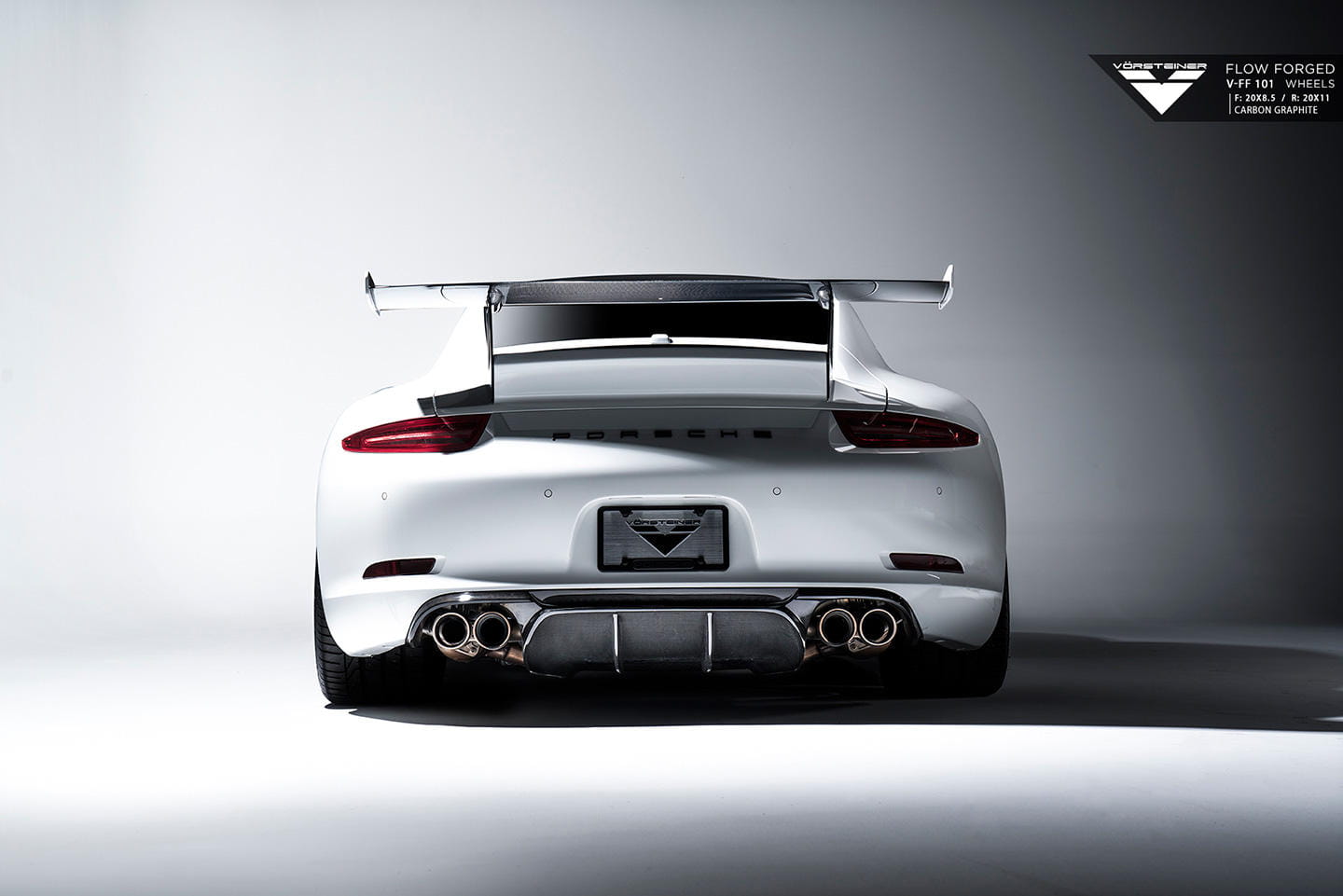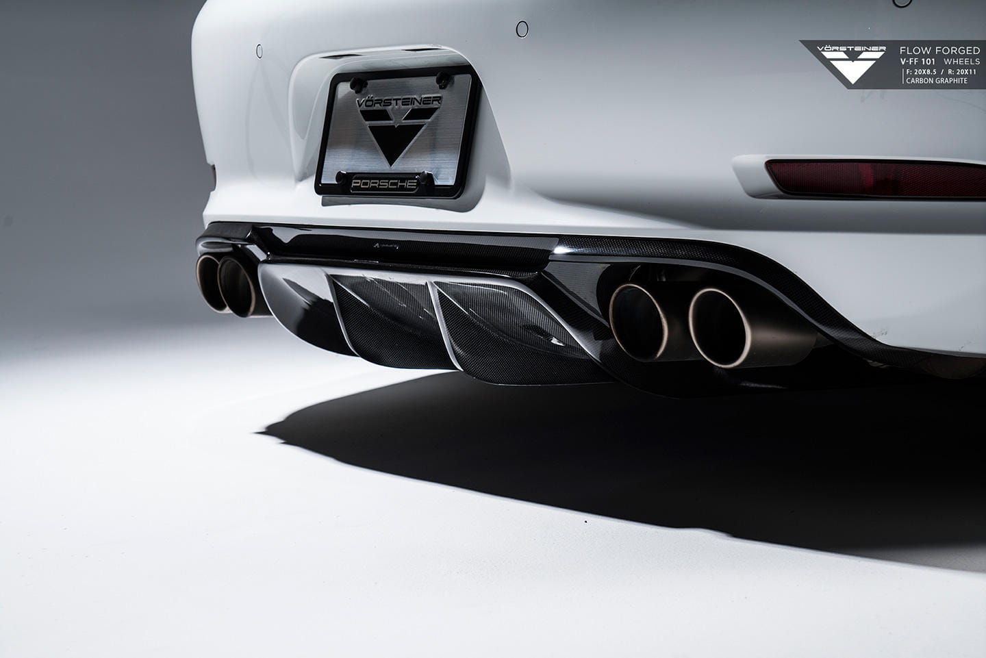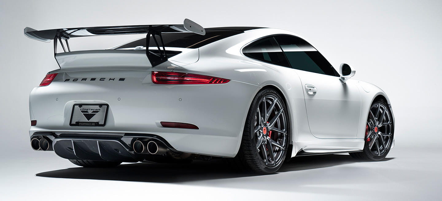 Si quieres llevarte un Porsche 911 con un aspecto realmente radical, no es necesario que te vayas a los GT3, ni al GT3 RS. De la mano de preparadores como Vorsteiner, un Porsche 911 Carrera S puede transformar por completo su imagen con un paquete aerodinámico que, más allá de lo estético, también es funcional. Salta a la vista la presencia de un inmenso alerón, construído en fibra de carbono, que nos recuerda irremediablemente a las versiones más radicales del 911, e incluso a sus versiones de competición.
