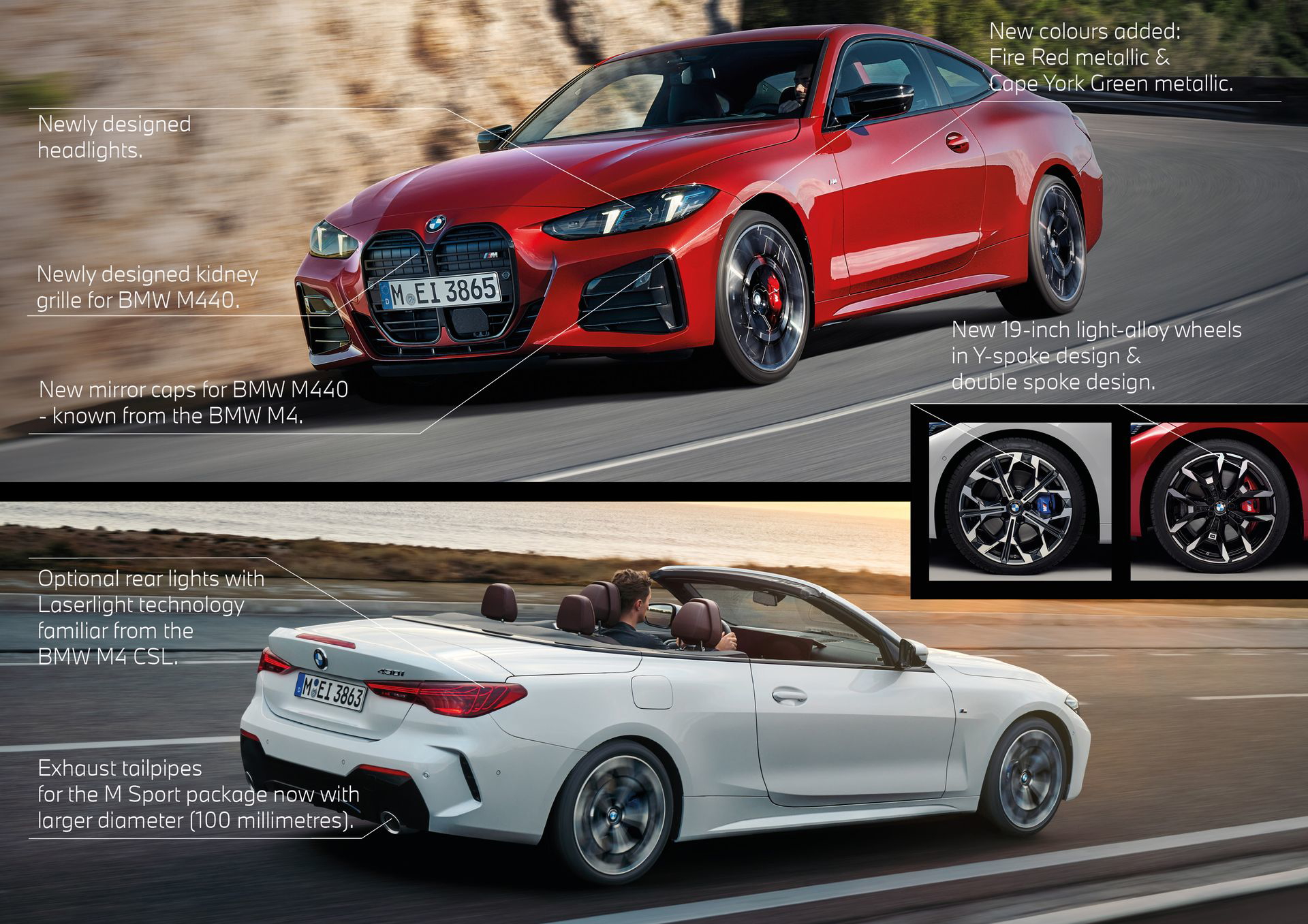 Las ópticas empleadas en el Serie 4 poseen un diseño afilado tanto en el frontal como en la zaga, empleando tecnología LED de serie, aunque pudiendo añadir tecnología láser en los faros principales. El catálogo de llantas disponible es amplio con tamaños de 17, 18 y 19″. Como punto a destacar, la gama Serie 4 ofrece un inmenso catálogo de personalización, tanto de mano de BMW Individual para pinturas o tapizados, como con BMW M Performance para los accesorios de carácter más deportivo: spoiler, vinilos, escape, molduras, etc.