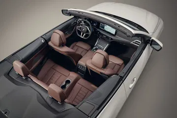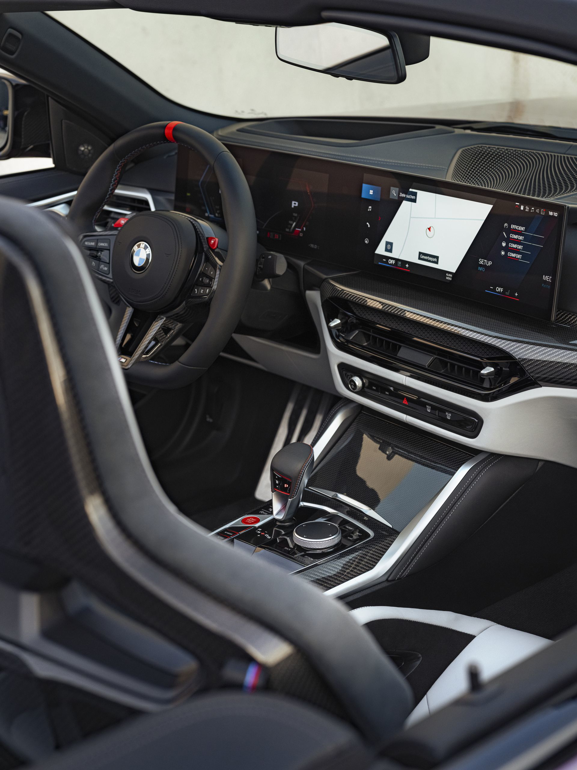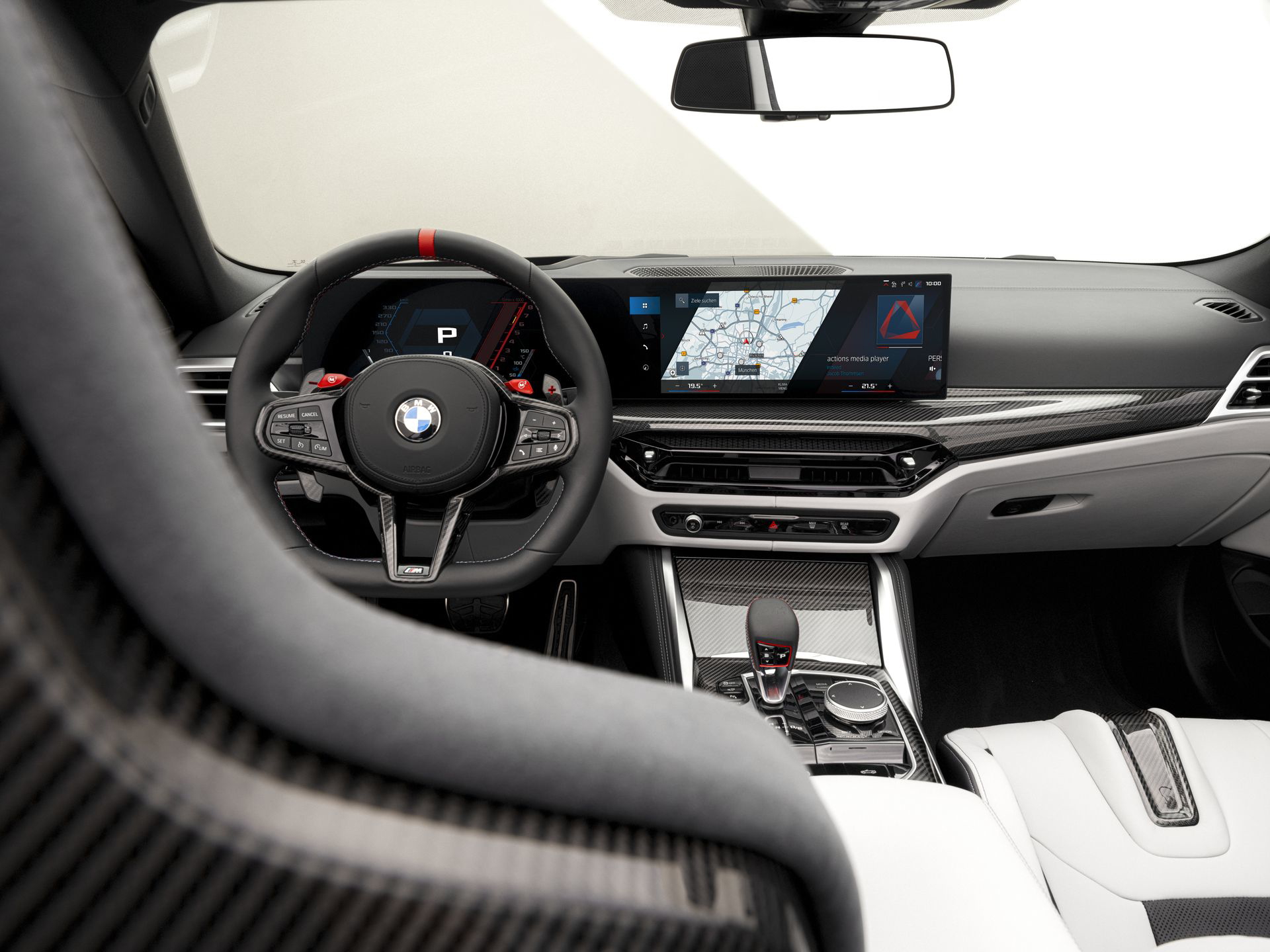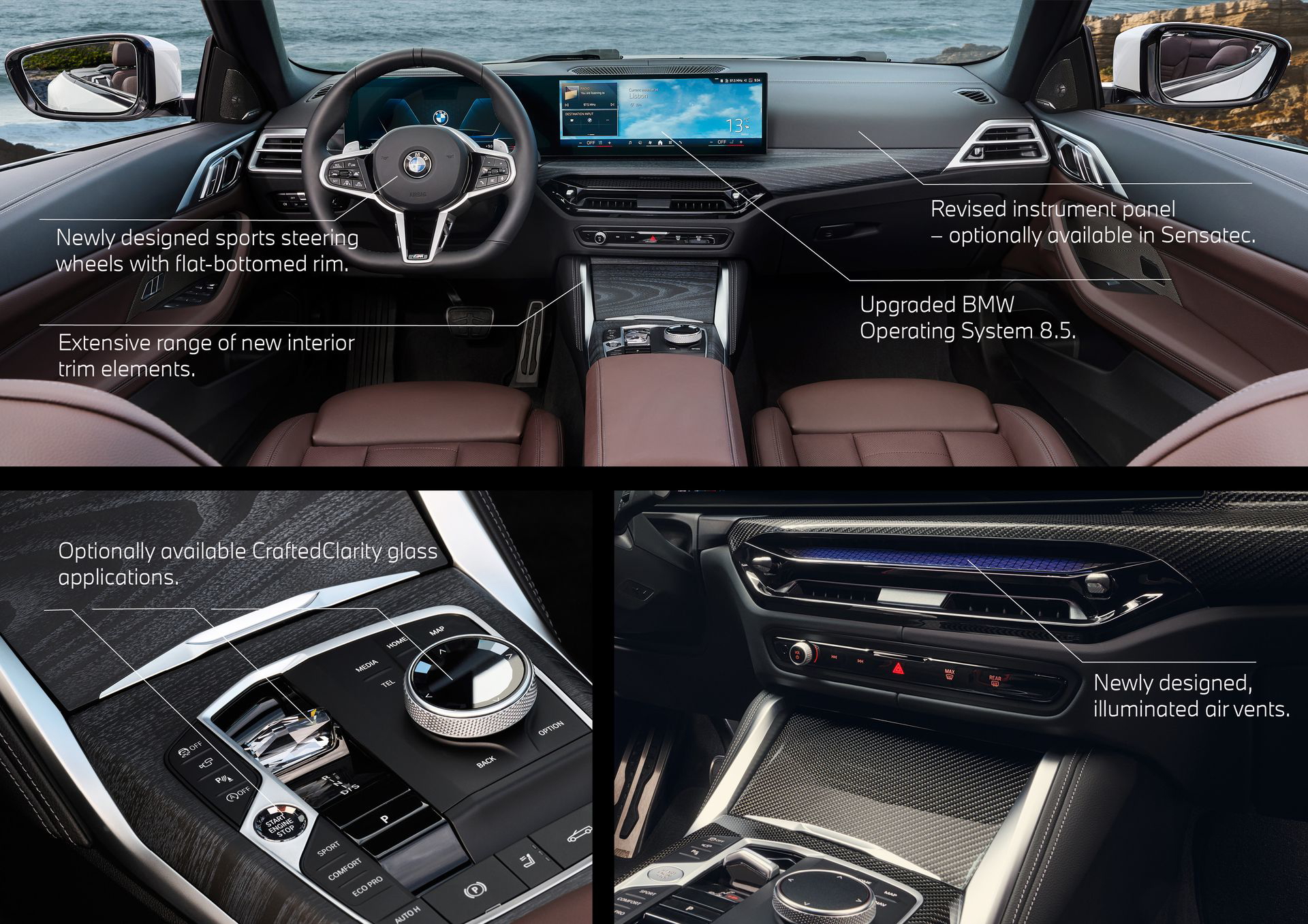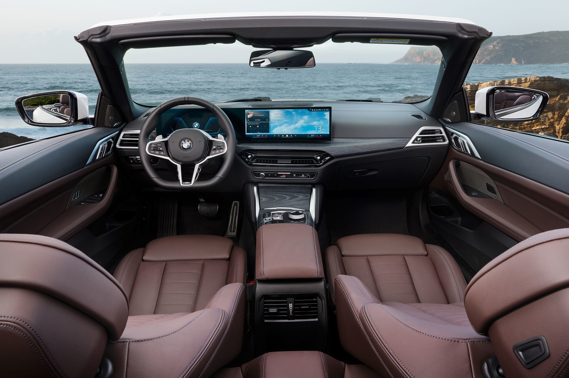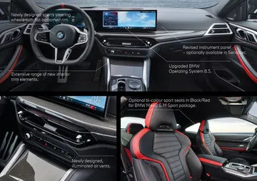 El diseño interior del BMW Serie 4 se caracteriza por una estética clásica y elegante, aunque esto no supone que BMW renuncie a la última tecnología o a un gran despliegue en infoentretenimiento, sino que da prioridad a la conducción y todo cuanto en ella repercute. Es por ello por lo que BMW se mantiene fiel al uso de mandos y controles físicos, como es el caso de la consola central con mando iDrive para el sistema multimedia. En cualquier caso, el gran protagonista del habitáculo es el BMW Curved Display, un gran panel curvo de cristal que integra dos pantallas de 12,3 pulgadas.