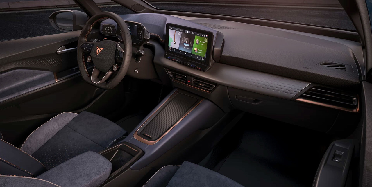 Los detalles en color cobre siguen presentes en el habitáculo, así como elementos tecnológicos vistos en otros modelos del grupo. Hablamos de componentes como el head-up display con realidad aumentada, Apple Car Play o Android Auto inalámbricos, carga inductiva para el teléfono móvil, asistente de crucero predictivo, reconocimiento de señales o Lane Assist. El maletero del CUPRA Born es de 385 litros.