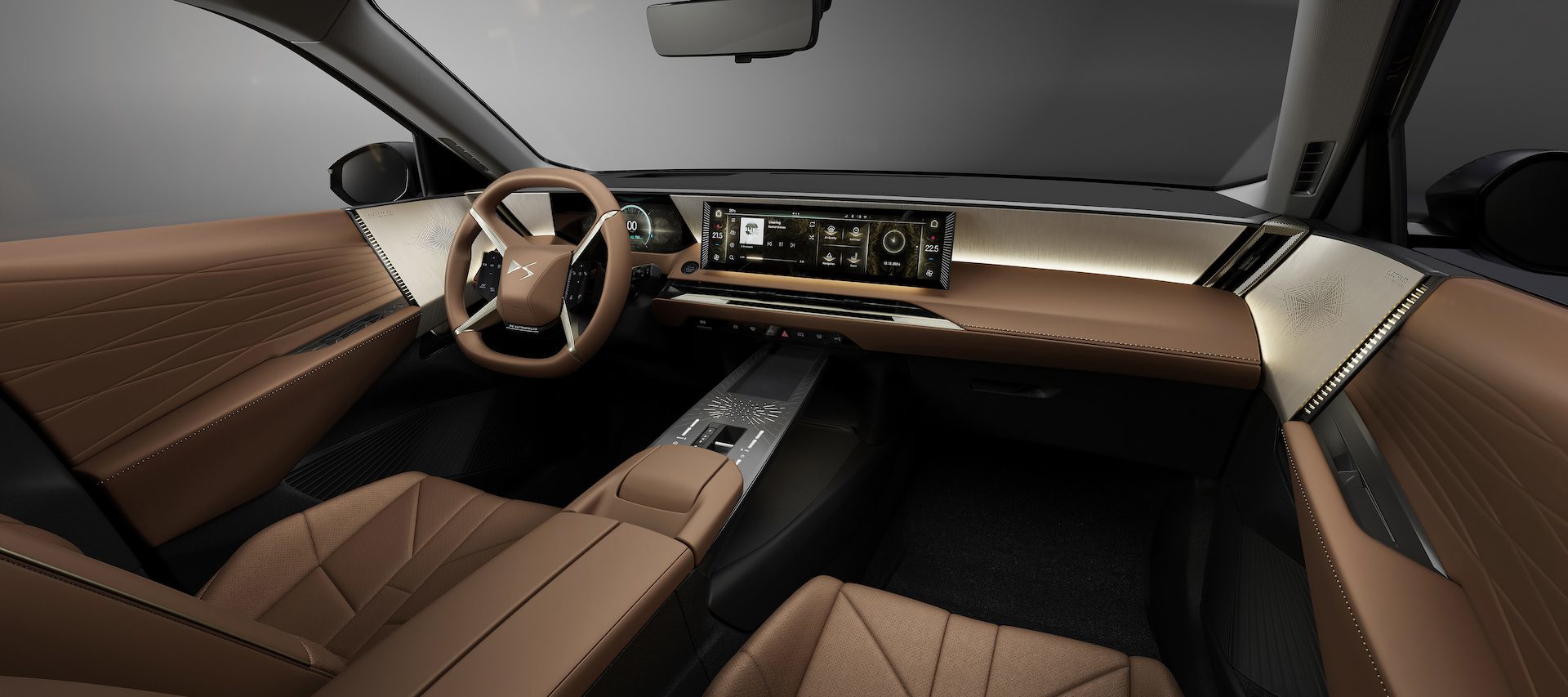 El habitáculo del DS Nº8 es más propio de un prototipo que de un coche de producción. Así lo dejan patentes su anguloso salpicadero, el minimalismo extremo y un volante de cuatro radios y achatado por arriba y por abajo. A ello debemos sumarle una gigantesca pantalla central de 16 pulgadas que aglutina todas las funciones del coche y cuenta con conexión con ChatGPT.