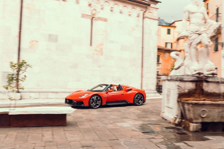 El diseño del Maserati MC Pura apuesta por unas proporciones muy bajas y anchas, con el motor situado en posición central trasera, lo que refuerza su carácter de superdeportivo. La silueta es muy fluida, con líneas tensas y superficies limpias que buscan un equilibrio entre agresividad y elegancia, una de las señas de identidad históricas de la marca.