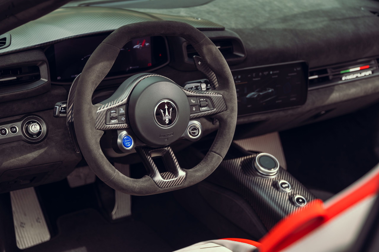 El interior del Maserati MCPura combina un diseño claramente orientado al conductor con materiales de alta calidad y una atmósfera muy deportiva. El salpicadero tiene un diseño envolvente, con una posición de conducción muy baja, y un volante forrado en Alcantara achatado en sus partes superior e inferior -muy similar al del GT2 Stradale de carreras-.