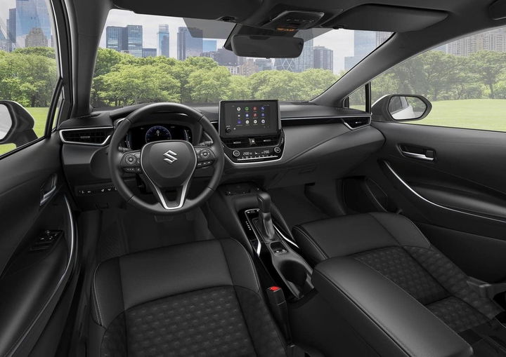 El interior del Suzuki Swace es idéntico al del Toyota Corolla. Salvo por detalles como los emblemas o el interior del volante, el diseño del habitáculo, los mandos y su disposición se mantiene intacta con respecto al Corolla. Entre los elementos de equipamiento merece la pena destacar el sistema multimedia con pantalla táctil de hasta 8″ compatible con Apple CarPlay y Android Auto, la instalación de una plataforma de carga inalámbrica, el cuadro de instrumentos con pantalla central LCD de hasta 7″ o la iluminación LED. También encontramos climatizador bizona, asientos delanteros y volante calefactable y diversas tomas USB para la recarga de dispositivos.