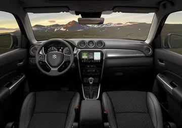 El interior del Suzuki Vitara es sencillo y espacioso. Dentro del segmento destaca por ser uno de los coches más grandes, casi a caballo con los más pequeños del segmento C-SUV, aunque no cuenta con un nivel de calidad especialmente destacado. Sus materiales y acabados están en la media del segmento y luce un diseño sobrio, algo oscuro y que prioriza el aspecto práctico por encima de un diseño innovador.