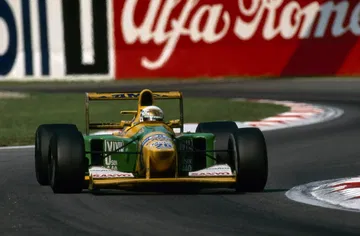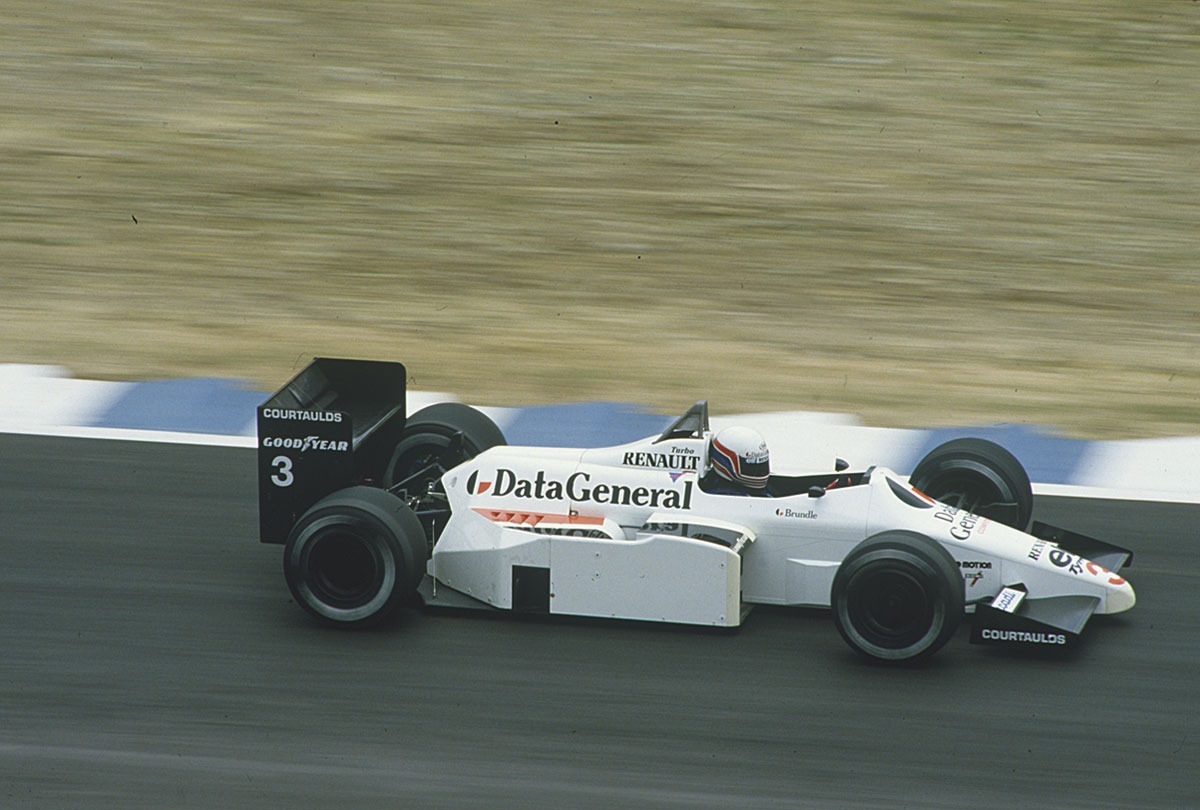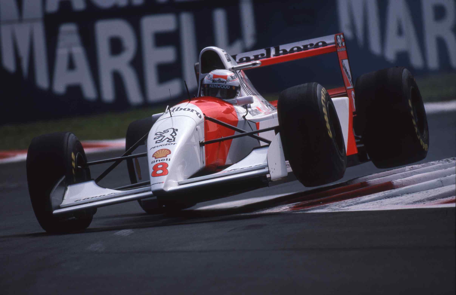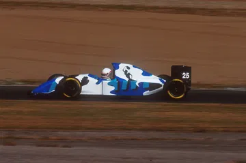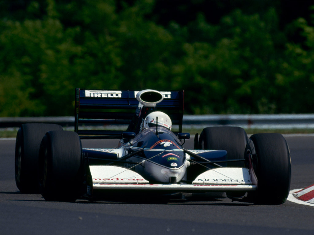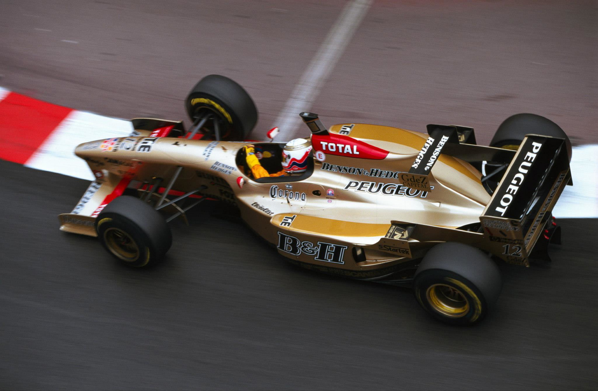 La mayor parte del casco de Brundle lucía este color, a excepción de tres líneas que bordeaban todo el casco por debajo de la visera en la parte frontal y a la altura de esta en el lateral y por detrás. Las líneas superior e inferior eran rojas, siendo la central azul y todas ellas coronadas con un sutil marco dorado. En la parte superior, el tradicional espacio de Marlboro se aseguraba que el resultado final no fuera excesivamente básico, con los logos de la marca y las líneas rojas.