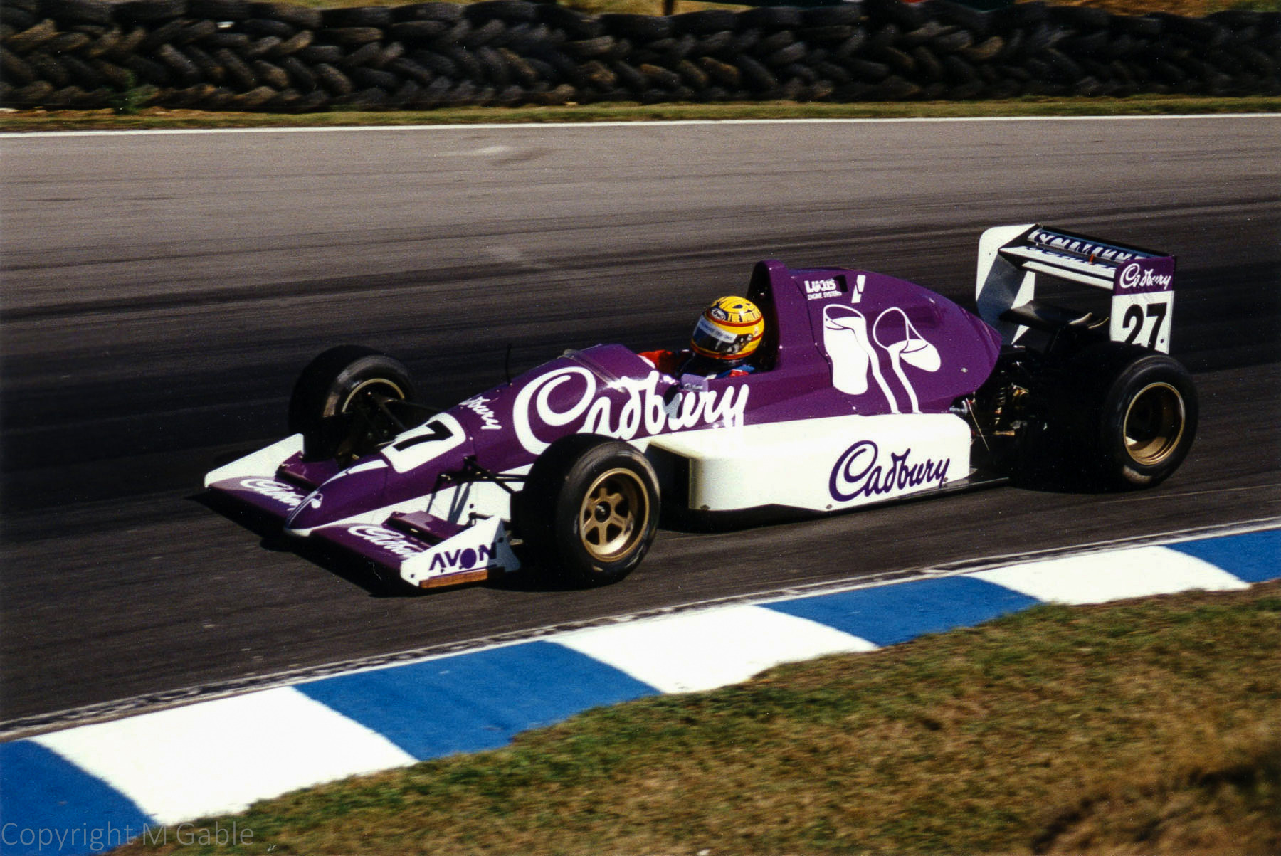 Pero seguramente, el detalle más significativo del casco de Mark Blundell no es otro que la parte superior, usando las letras -MB- en amarillo sobre fondo azul. El motivo de las letras no es otro que ser las iniciales del piloto británico. Estas le daban una imagen muy particular y sobre todo resultaban especialmente distintivas desde las llamadas «T-Cam» de los Fórmula 1, las cámaras a bordo encima de la toma de aire.