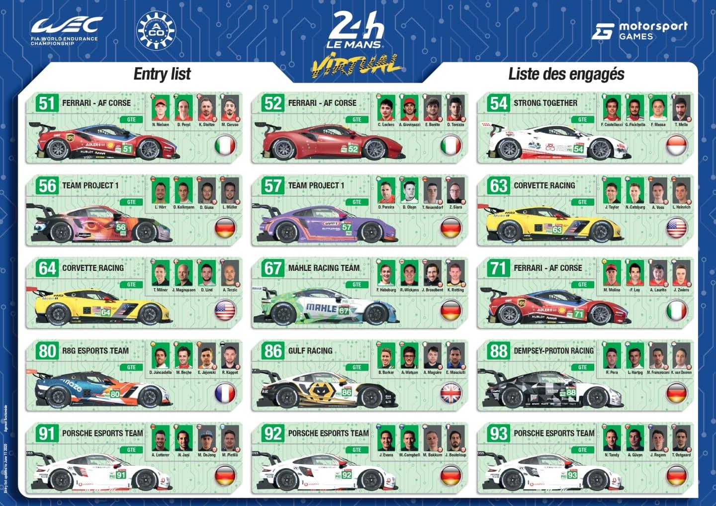 El nivel de calidad detrás de la pantalla estará asegurado, con una inscripción tan destacada que contará con Alonso y Rubens Barrichello en Allinsports, Max Verstappen se unirá con Lando Norris en Team Redline, Jenson Button al frente de su equipo, Team Rocket. Jean-Éric Vergne competirá con su compatriota Pierre Gasly en Veloce Esports, mientras que entre los GTE hay nombres tan destacados como los de El GTE no debe ser superado. Charles Leclerc uniéndose junto a Antonio Giovinazzi en AF Corse (en un equipo en el que estará Enzo Bonito), al igual que Felipe Massa y Giancarlo Fisichella.