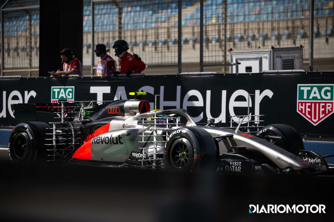 El Audi ha sorprendido cuando ha enfocado la salida del pit-lane con su pertinente parrilla de sensores. Tras el enrejado se podía apreciar el trabajo de los ingenieros y diseñadores a la hora de crear unas entradas de aire completamente verticales, lo que ha permitido adelgaza a su vez esa sección central del monoplaza, creando una silueta que aparentemente sirve para redireccionar el flujo de aire tanto al alerón trasero, como para alejarlo de las ruedas posteriores y de crear por tanto ese drag. También se puede apreciar un canal que sería el encargado de llevar ese flujo para hacer funcionar el difusor.