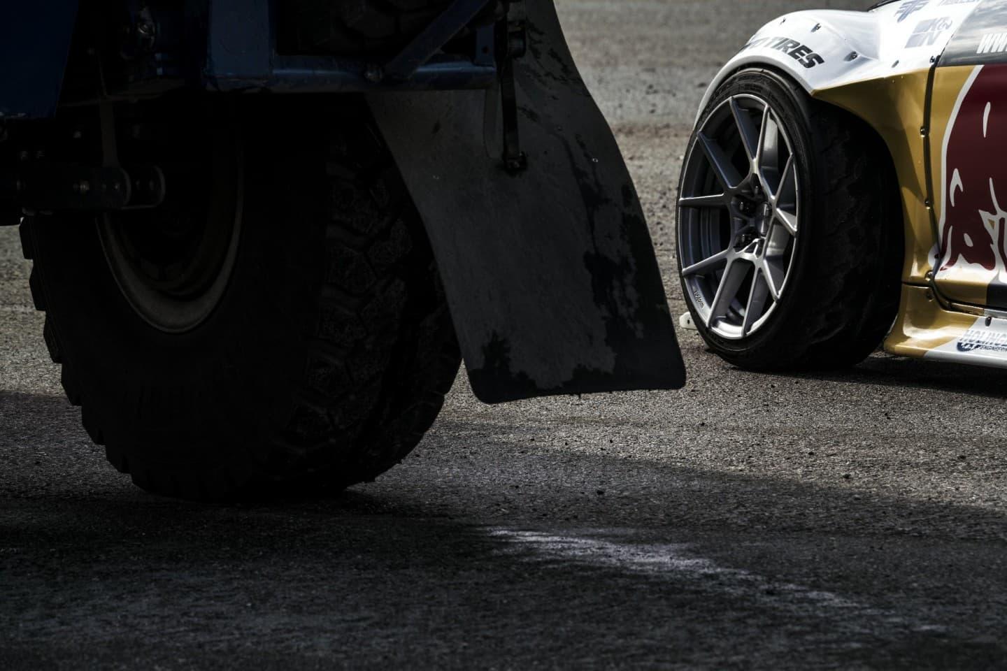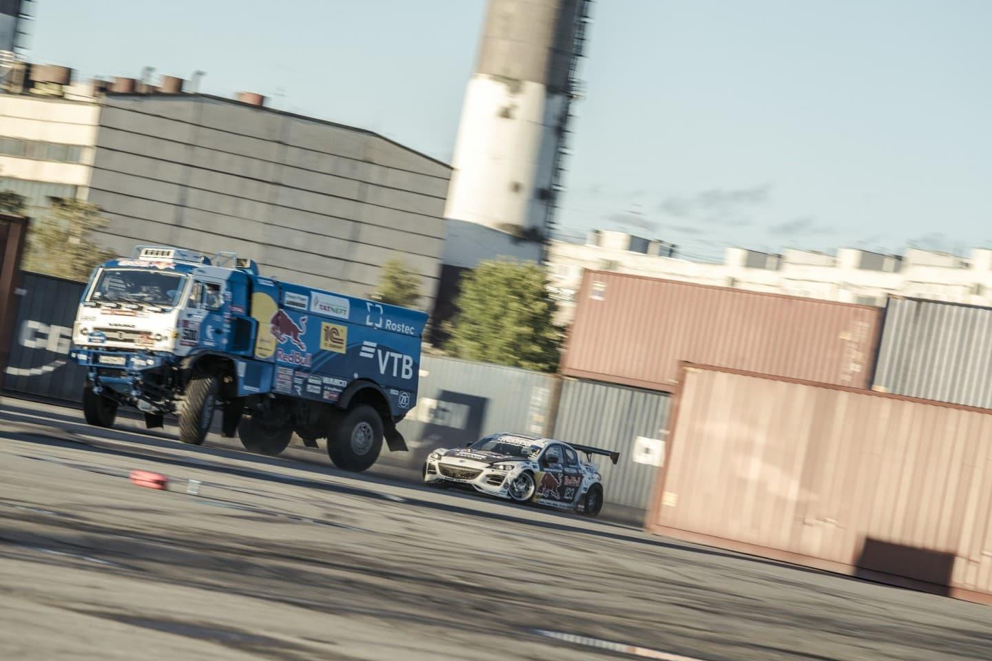 La idea surgió durante el año pasado, cuando ambos formaron parte del Festival de la Velocidad de Goodwood y nos deja ver a la perfección la agilidad con la que se mueven los vehículos T4 de la categoría de camiones a pesar de que sus proporciones son mastodónticas tal y como se puede apreciar al situar una de las ruedas del KAMAZ al lado del Mazda con motor de cuatro rotores de Whiddett, sin duda la gran estrella de la factoría Red Bull en materia de Drift y protagonista de muchos de sus vídeos.