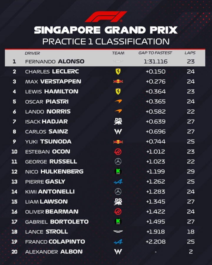El Gran Premio de Singapur arranca con una gran historia que contar, y esta es la del mejor tiempo de Fernando Alonso, el más rápido en la primera sesión de entrenamientos libres del fin de semana. El asturiano hace soñar a sus aficionados y a todo el equipo Aston Martin en un año en el que las cosas no están saliendo como buscaban. El tiempo dirá si realmente pueden darse, y está claro que pensar en pelear por la pole position o la victoria no es realista, pero en cualquier caso siempre es mejor arrancar un evento con una primera posición que con una vigésima.