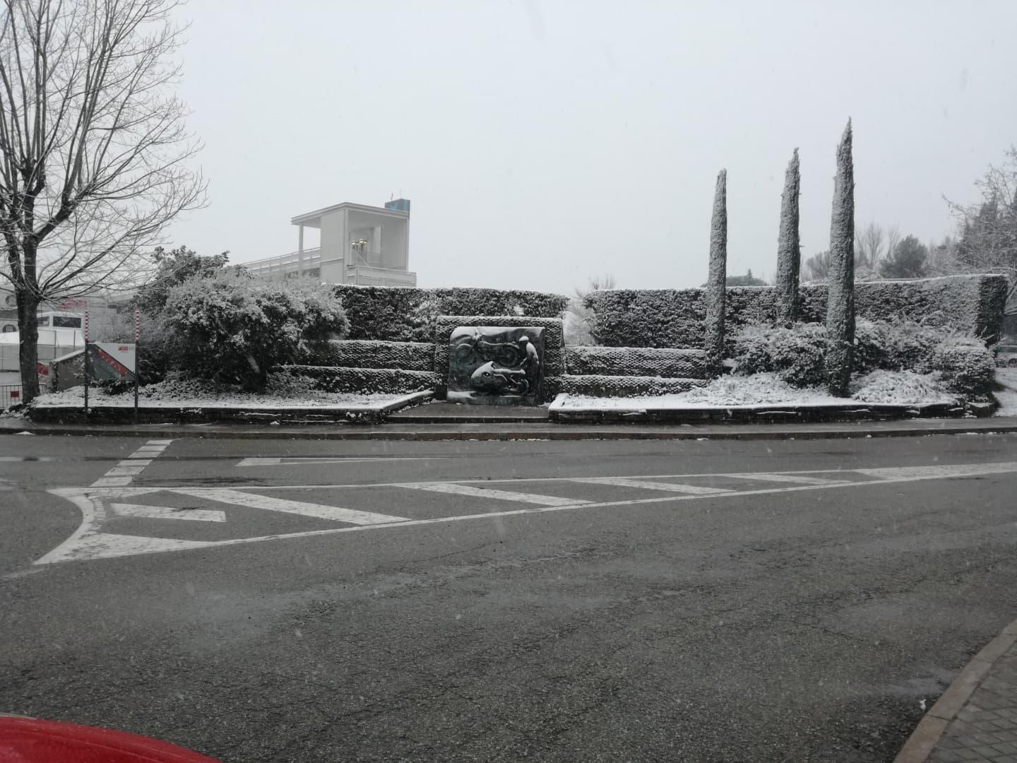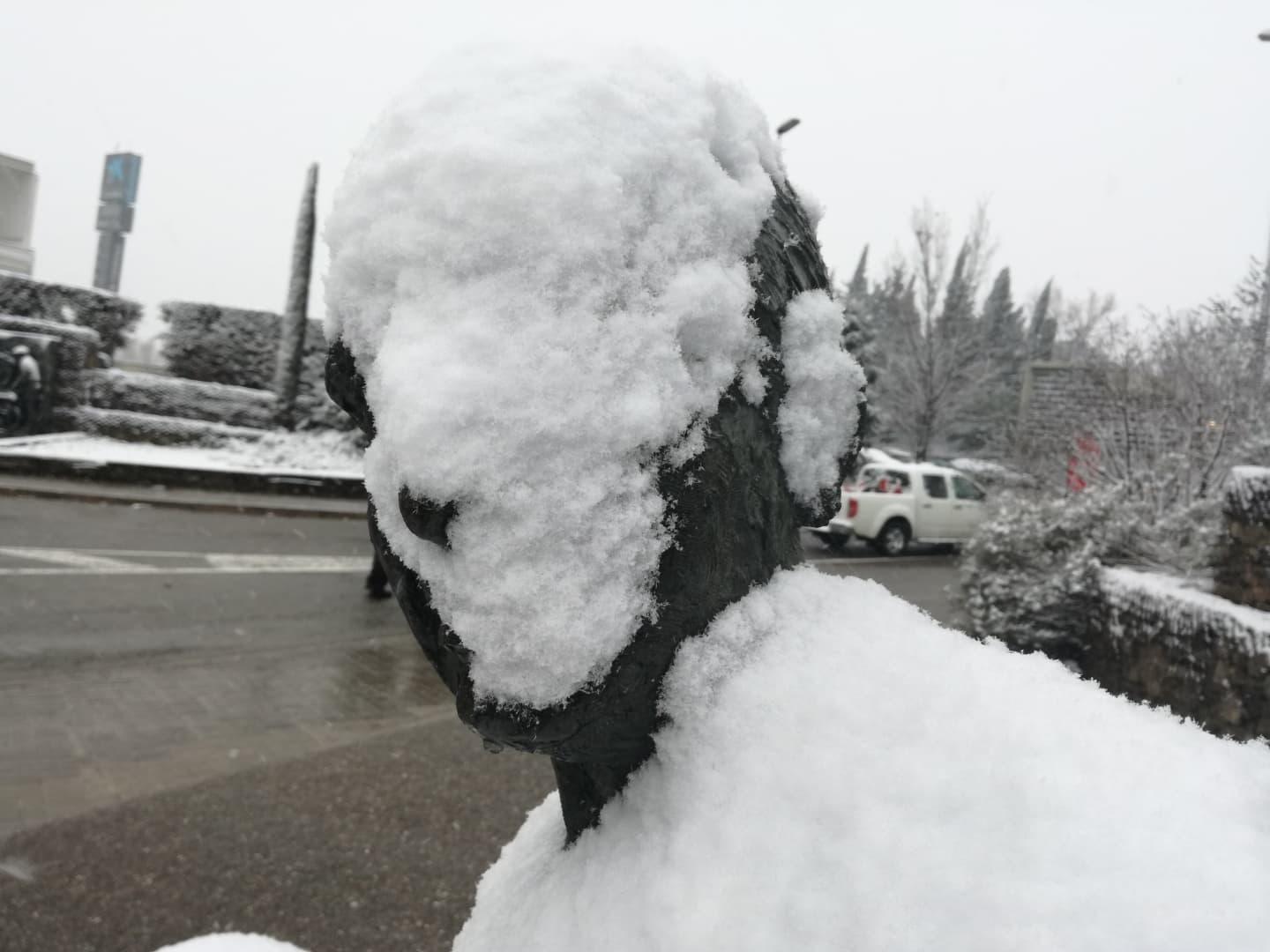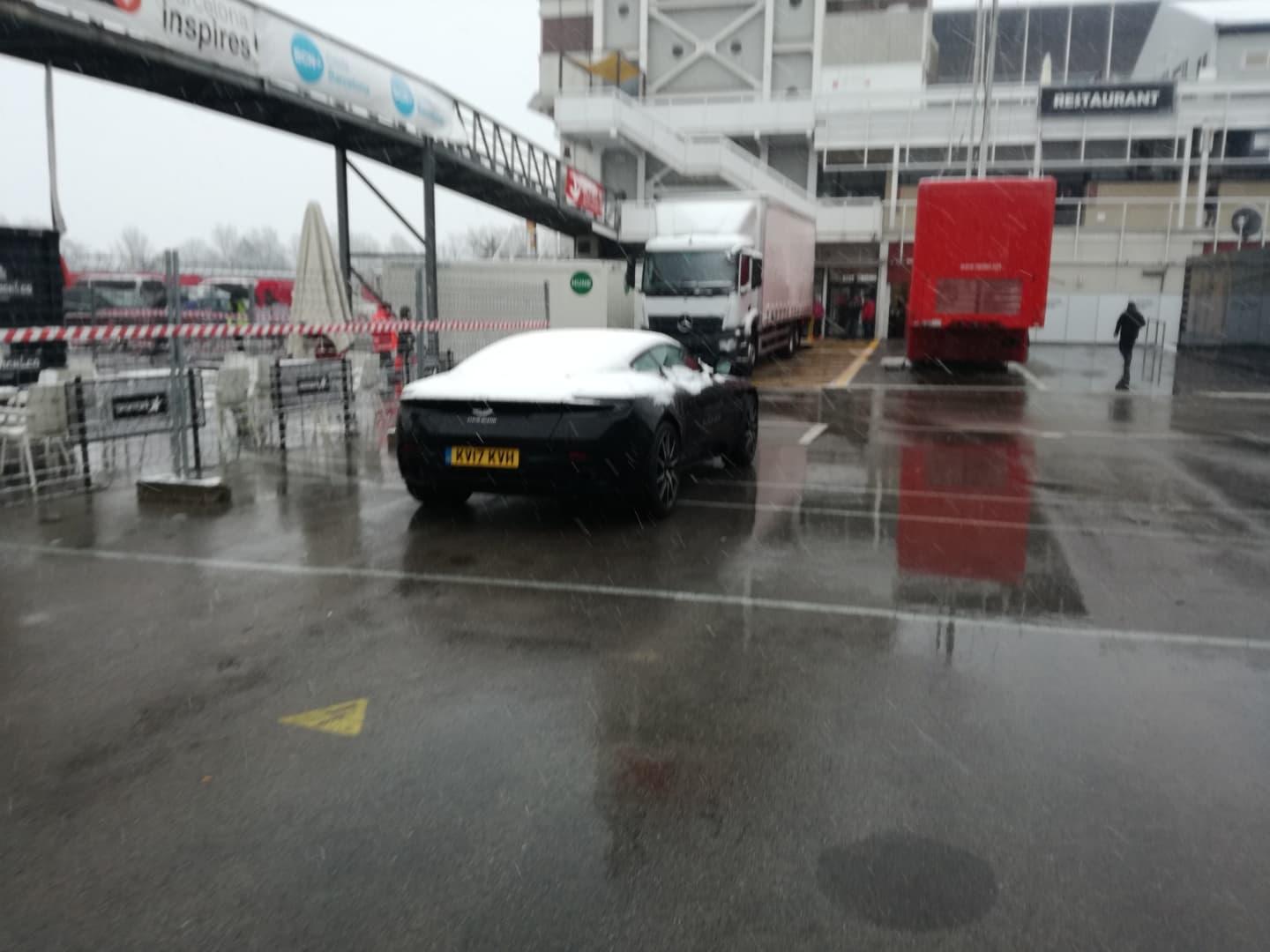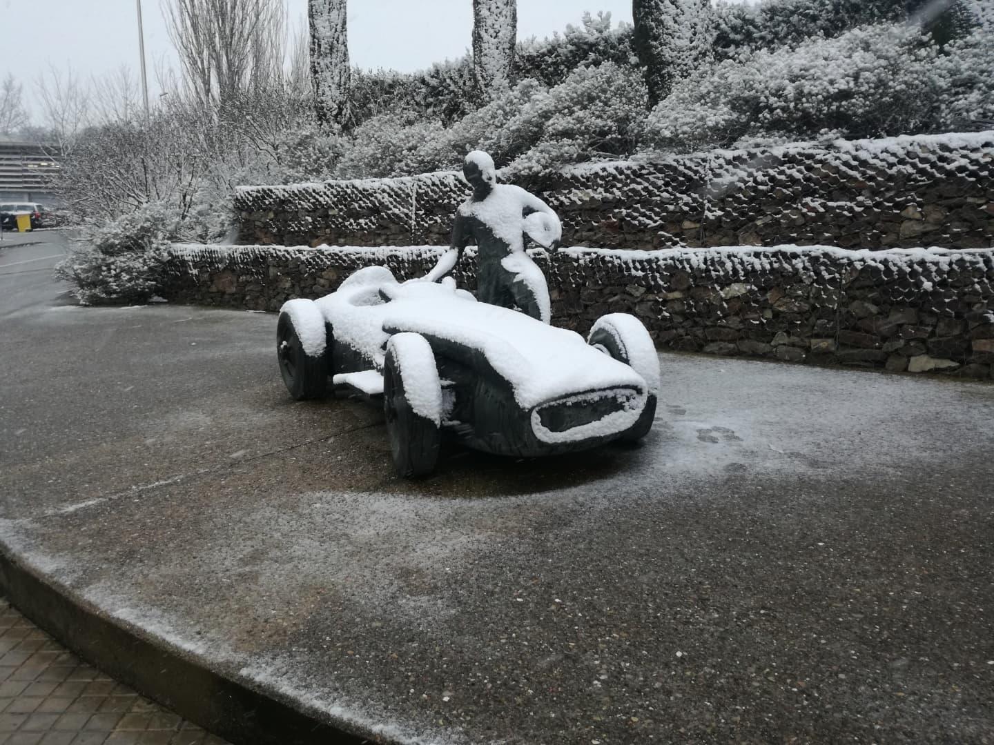 Entre las estampas nevadas se encuentran la estatua de Juan Manuel Fangio, habitante de la entrada del paddock del Circuit. Hay que recordar que es muy probable que no se ruede durante todo el día, dependiendo exclusivamente de la nieve y de la posible mejora del tiempo. Lo único que no se espera es la aparición del sol, hecho que facilitaría mucho más los procedimientos.