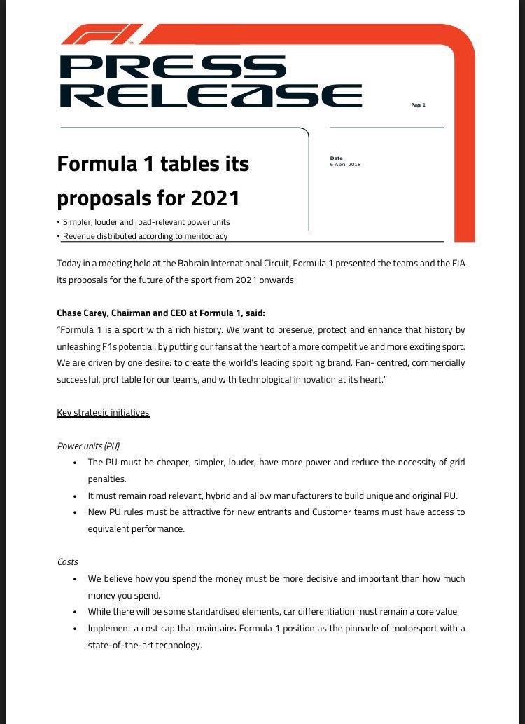 Los apartados sobre costes e ingresos van realmente de la mano. Liberty Media reitera su voluntad de imponer un techo presupuestario y que lo que determine el rendimiento final sea cómo se gasta el dinero y no el cuánto permitiendo además que quiénes mejor rendimiento obtengan aspiren también a mayores ingresos. ¿Hablamos por lo tanto del fin de los derechos históricos de equipos como Ferrari o Mercedes? Además plantean una mayor estandarización de todos aquellos elementos no ‘visibles’ por los aficionados: sólo quedarán a salvo de estas medidas la aerodinámica, las suspensiones y los motores.