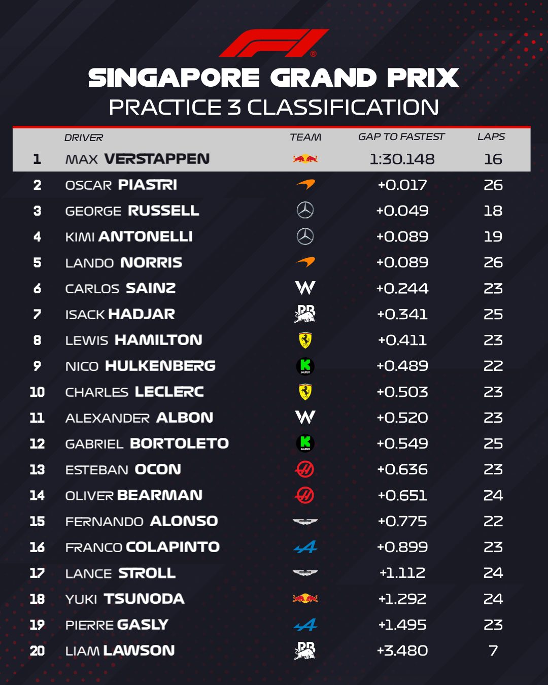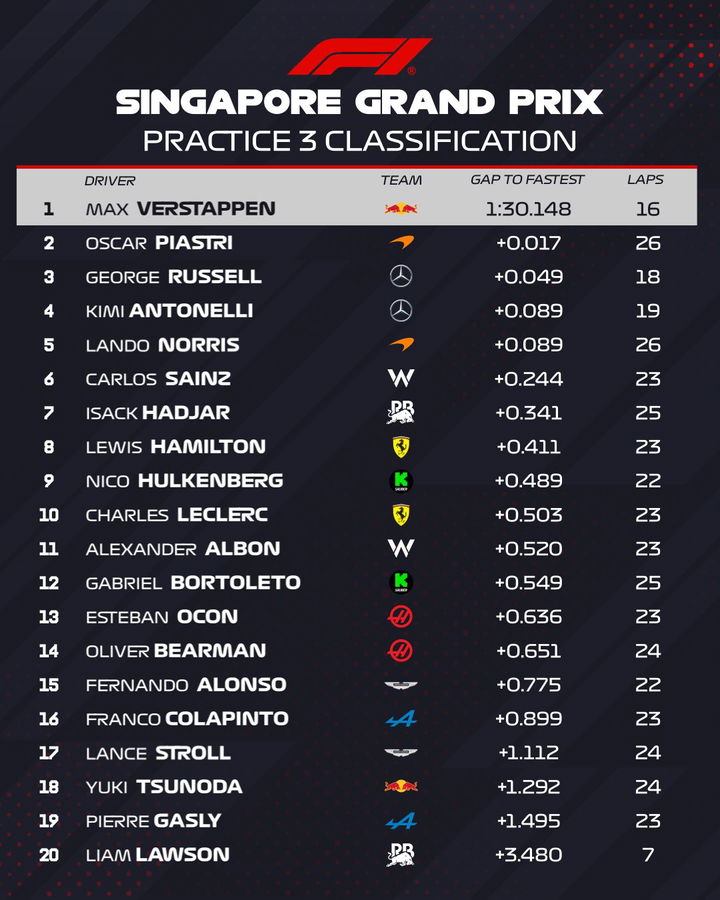 Completaban las 10 primeras posiciones Lewis Hamilton, Nico Hülkenberg y Charles Leclerc, mientras que Alex Albon se quedaba a las puertas, seguido por Bortoleto y los dos Sauber, mientras que Fernando Alonso se quedó mucho más atrás que este viernes, decimoquinto. El asturiano ya lo adelantaba ayer diciendo que los viernes suelen ser muy buenos para ellos y que los sábados daban un paso atrás, especialmente sabiendo que quedaban algunos pilotos de equipos top que ayer no mostraron su velocidad.