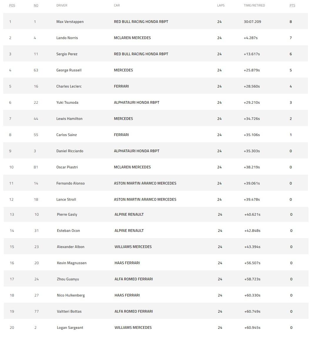 Llegando a las última vueltas, Hamilton se quedaba sin neumáticos, permitiendo que Leclerc y Tsunoda le superaran en el espacio de un solo giro. Por delante, Max Verstappen no tuvo ningún problema para confirmar su victoria, con una sólida ventaja sobre Lando Norris, en un buen segundo puesto. Sergio Pérez se hizo con la tercera posición, batiendo a un George Russell que acabó cuarto en solitario. Charles Leclerc completó el top 5 con Yuki Tsunoda en un más que respetable sexto puesto. Cerraron la zona de puntos Lewis Hamilton y Carlos Sainz, en una octava posición defendida ‘in extremis’ de los ataques de Ricciardo.