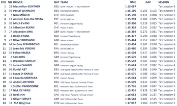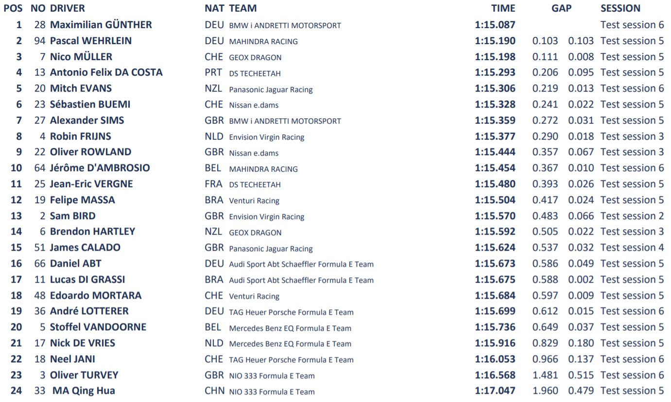 En cuanto a los resultados combinados de los tres días, todos los pilotos exceptuando a los dos NIO, Oliver Turvey y Ma Quin Hua, han acabado a menos de un segundo del tiempo de Günther. Mercedes y Porsche, en su primera prueba real contra el resto de equipos, han estado algo alejados de los puestos de cabeza en cuanto a tiempos. El mejor clasificado de los cuatro ha sido el alemán André Lotterer, en decimonovena posición.
