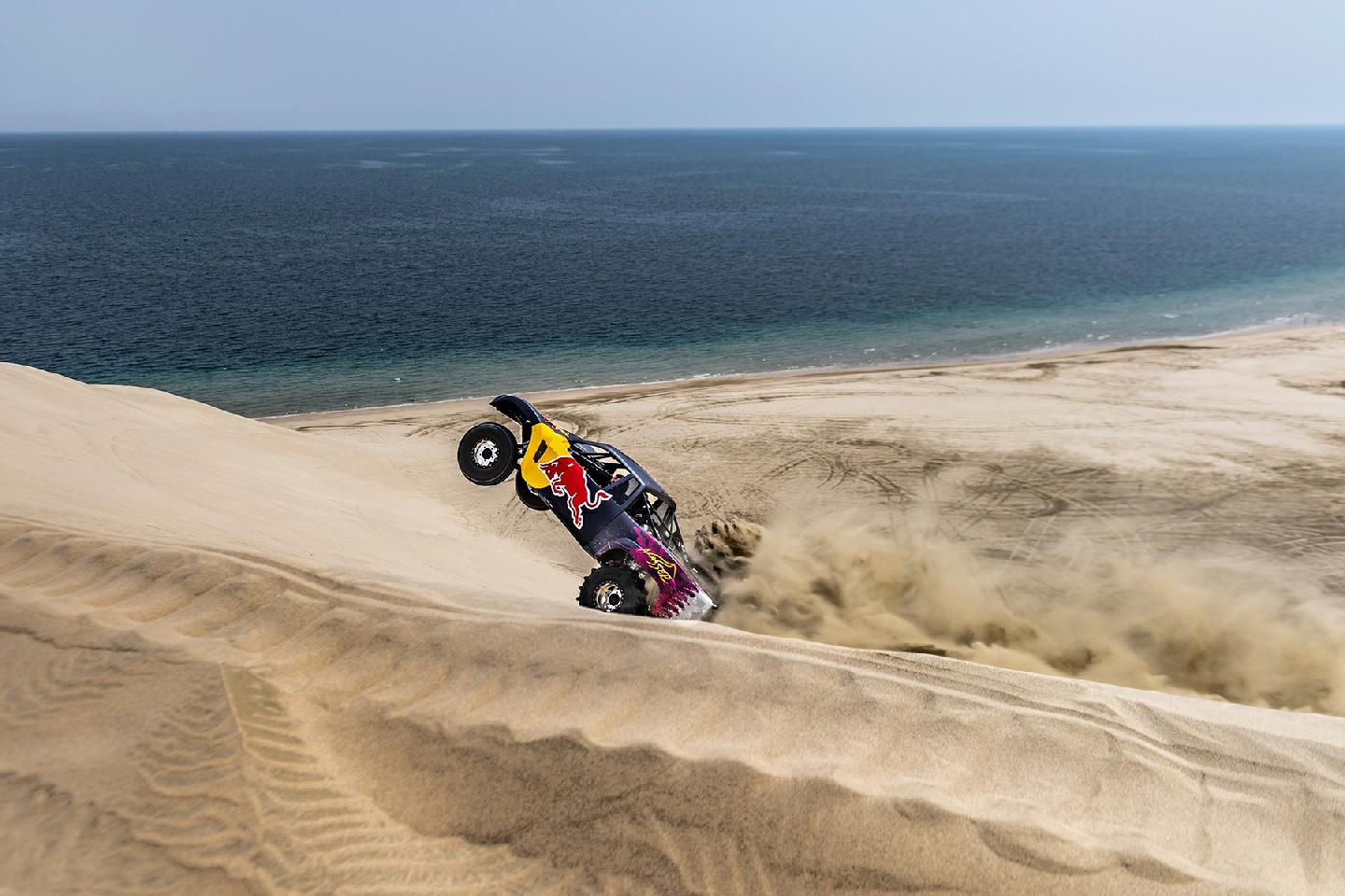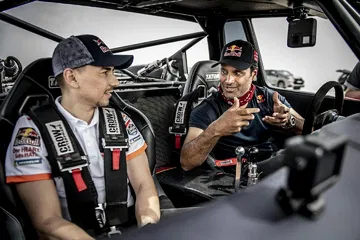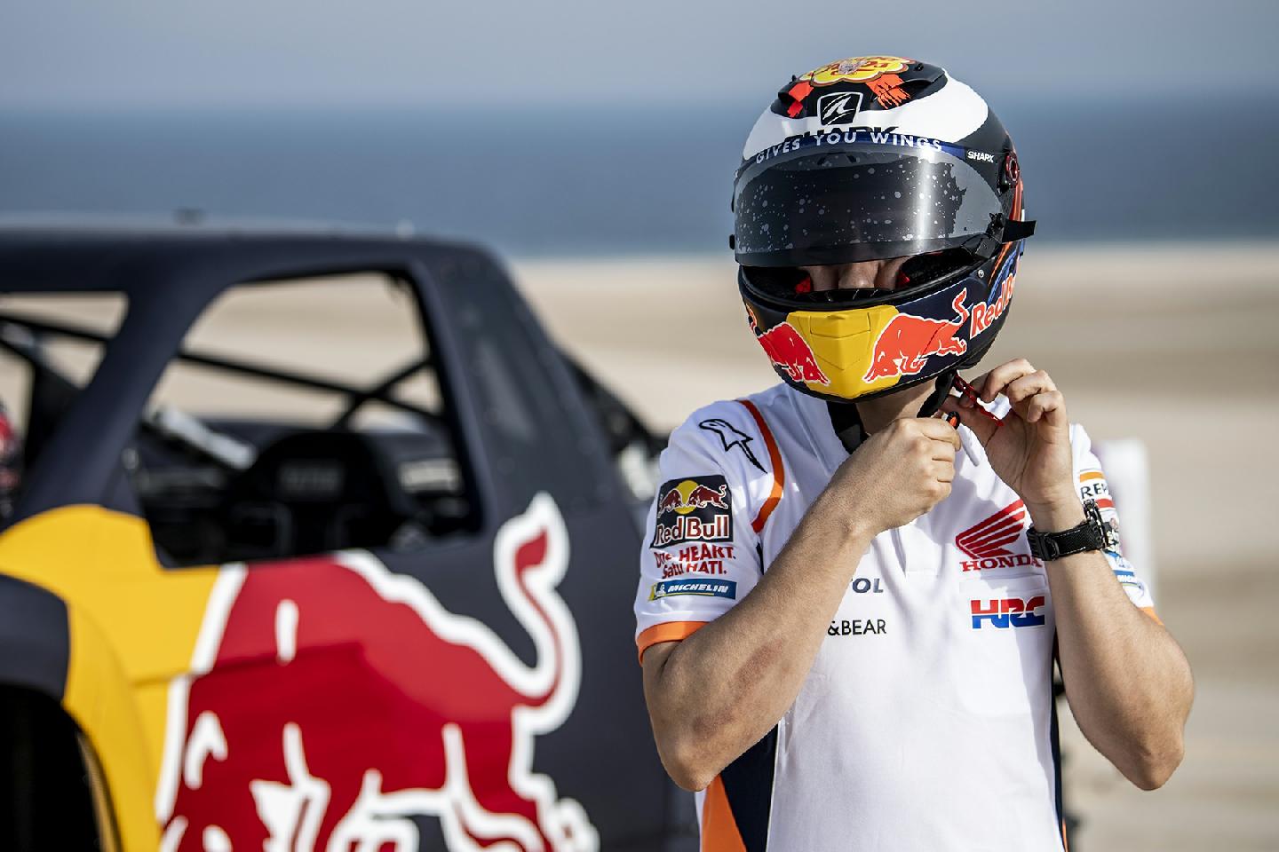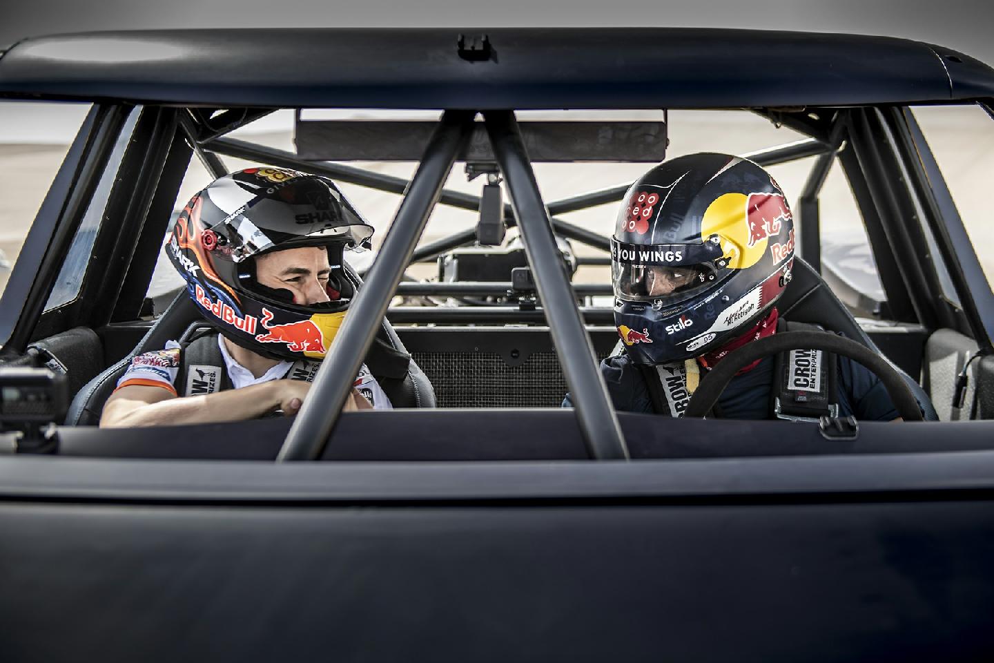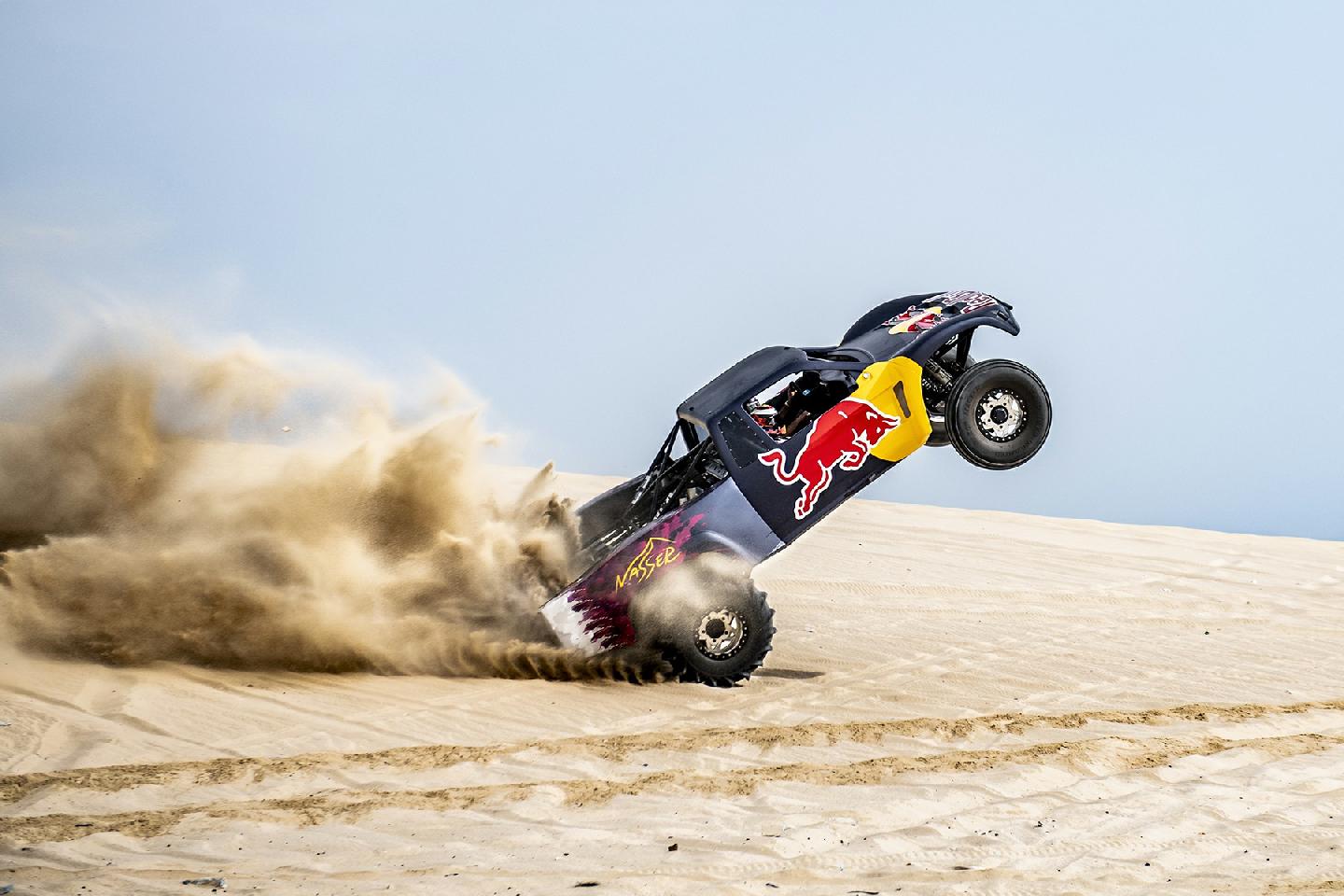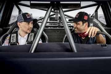 Y es que no es lo mismo hacer caballitos con tu Moto GP a 200 km/h, que sentarte a la derecha de un Príncipe qatarí y dirigirte a toda velocidad hacia una duna del desierto gigante. El mallorquín no podía hacer otra cosa que mirar al cielo en cada acelerón de Nasser. Y es que este brutal buggy desarrollado específicamente para la arena es capaz de hacer wheelies a toda velocidad por la arena. No le faltan caballos al truck de un Nasser Al-Attiyah, que comenzaba su búsqueda del título de la Copa del Mundo FIA de Rallyes Cross-Country con victoria hace poco más de una semana en la primera cita de Qatar.