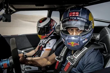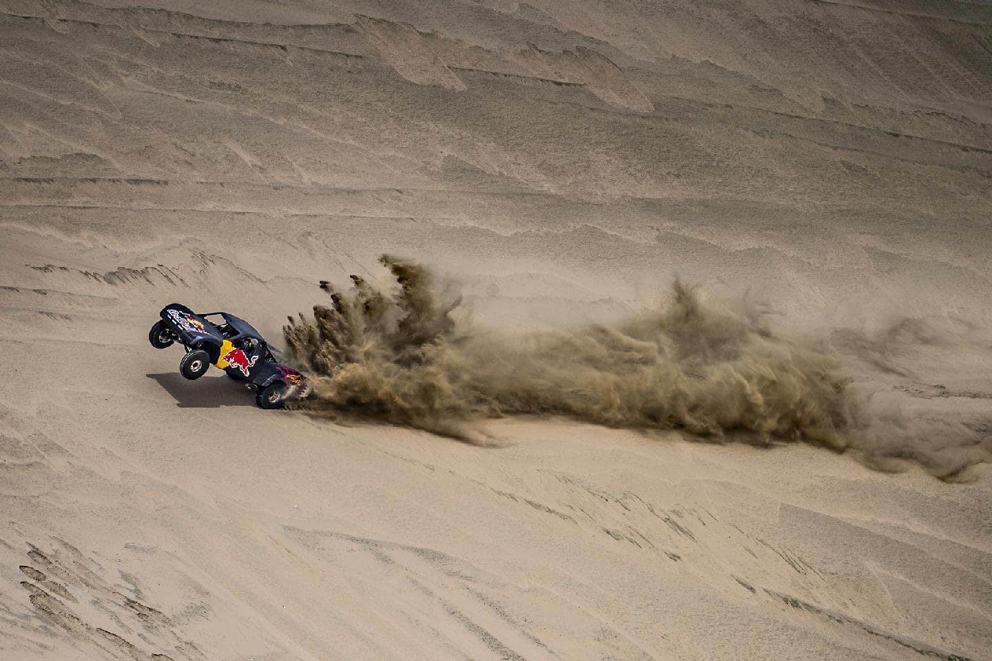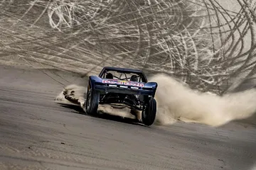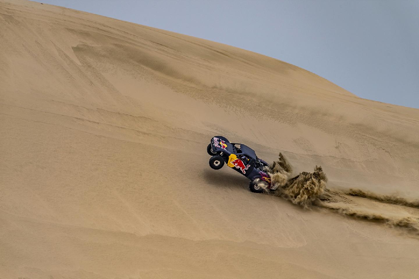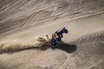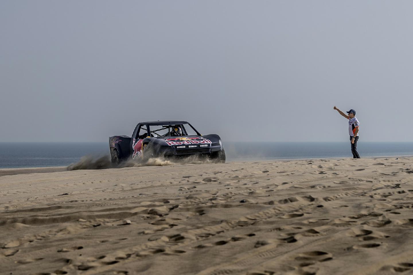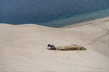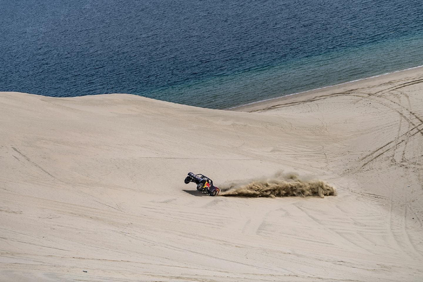 Y es que no es lo mismo hacer caballitos con tu Moto GP a 200 km/h, que sentarte a la derecha de un Príncipe qatarí y dirigirte a toda velocidad hacia una duna del desierto gigante. El mallorquín no podía hacer otra cosa que mirar al cielo en cada acelerón de Nasser. Y es que este brutal buggy desarrollado específicamente para la arena es capaz de hacer wheelies a toda velocidad por la arena. No le faltan caballos al truck de un Nasser Al-Attiyah, que comenzaba su búsqueda del título de la Copa del Mundo FIA de Rallyes Cross-Country con victoria hace poco más de una semana en la primera cita de Qatar.
