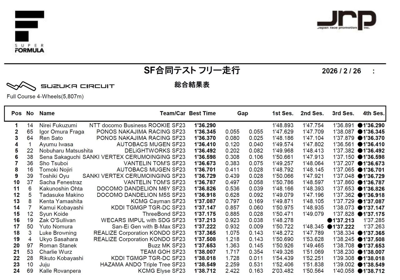 El finlandés evitó la última posición, marcando el vigésimo primer tiempo el miércoles. El jueves, sí que fue el más lento en pista, aunque a menos de dos décimas de Juju Noda, que debería ser su primer objetivo esta temporada. En el cómputo final, tras Fukuzumi, el más rápido, se encuentran los pilotos de Nakajima Racing, Igor Fraga y Ren Sato. El actual campeón, Ayumu Iwasa, fue cuarto, preparándose para un año en el que necesita convencer a la Fórmula 1 de que tiene lo necesario para competir allí. El veterano Nobuharu Matsushita completó el top 5, mientras Yuto Nomura fue el mejor de los debutantes en décimo séptima posición. La primera cita de la temporada llegará en Motegi el primer fin de semana de abril.