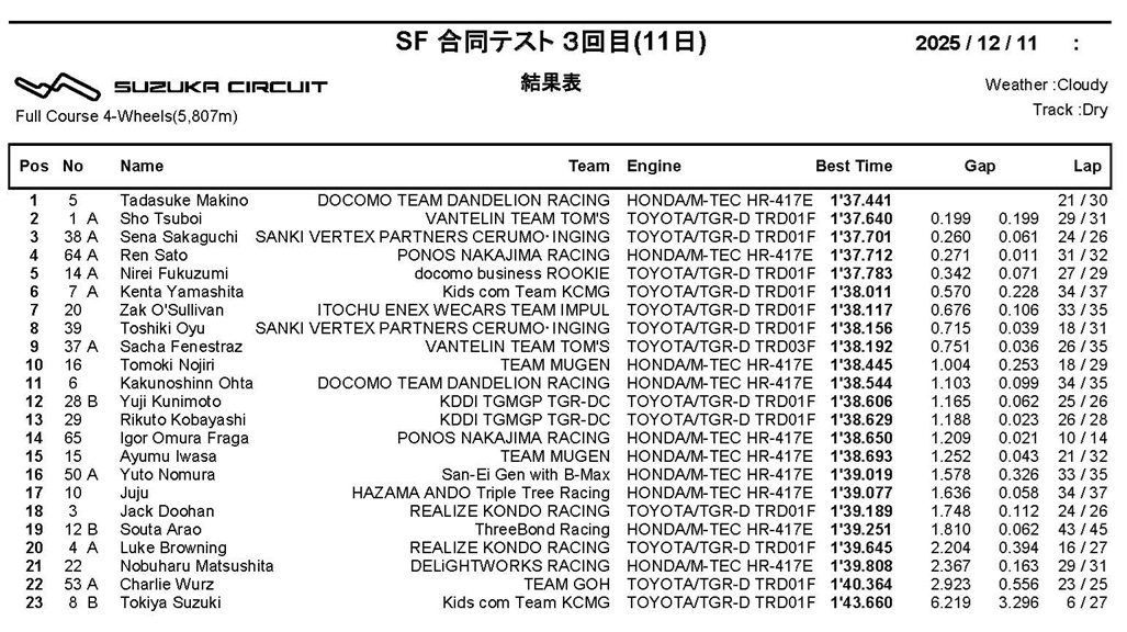 De esta forma, las novedades del día las protagonizaron Luke Browning con Kondo Racing, recién llegado de Abu Dhabi, donde certificó el cuarto puesto en la Fórmula 2 antes de tomar parte en los test de Fórmula 1 en Yas Marina con Williams, Souta Arao con Threebond Racing, Ayumu Iwasa esta vez sí rodando todo el día con Mugen tras su incorporación de última hora ayer y Yuji Kunimoto en TGMGP, en lugar de un Kamui Kobayashi que está ocupado con pruebas del WEC. Finalmente, Tokiya Suzuki, campeón de la Formula 4 japonesa ha adelantado su debut, ocupando el coche de Kalle Rovanperä en KCMG. Por lo demás, mismas alineaciones en los demás equipos, permitiendo cierta estabilidad en los planes de trabajo de la última jornada ‘convencional’ de este 2025, antes de dejar paso a los debutantes de cara a mañana.