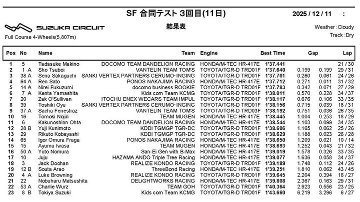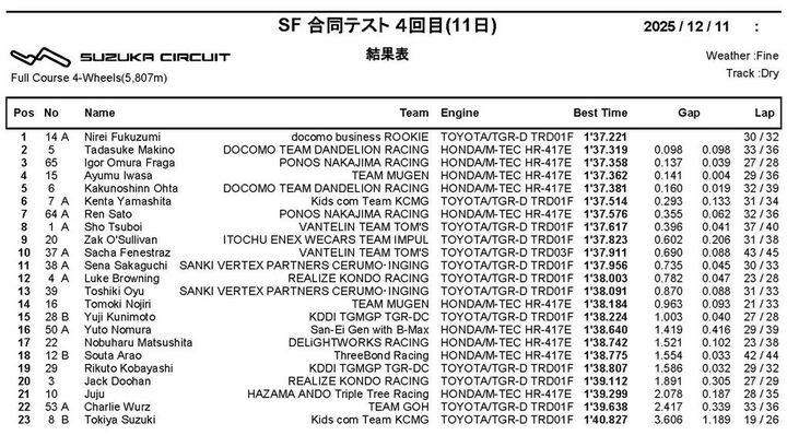 De esta forma, las novedades del día las protagonizaron Luke Browning con Kondo Racing, recién llegado de Abu Dhabi, donde certificó el cuarto puesto en la Fórmula 2 antes de tomar parte en los test de Fórmula 1 en Yas Marina con Williams, Souta Arao con Threebond Racing, Ayumu Iwasa esta vez sí rodando todo el día con Mugen tras su incorporación de última hora ayer y Yuji Kunimoto en TGMGP, en lugar de un Kamui Kobayashi que está ocupado con pruebas del WEC. Finalmente, Tokiya Suzuki, campeón de la Formula 4 japonesa ha adelantado su debut, ocupando el coche de Kalle Rovanperä en KCMG. Por lo demás, mismas alineaciones en los demás equipos, permitiendo cierta estabilidad en los planes de trabajo de la última jornada ‘convencional’ de este 2025, antes de dejar paso a los debutantes de cara a mañana.