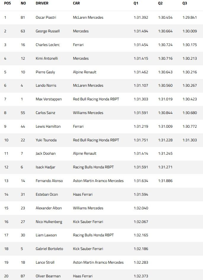 Los Mercedes hicieron psicología inversa y abrieron el segundo run en busca de batir a McLaren. Antonelli puso su giro final en 1:30.2, mejorado el apurado Russell (1:30.009). Leclerc se situó a una décima del inglés y Piastri (1:29.841) les batió a todos como único integrante del 1:29. Gasly se coló en tercera fila delante de un flojo Norris, cerrando el top 10 Verstappen, Sainz, Hamilton y un Tsunoda al que no le sirvió madrugar en la tanda decisiva pero al menos entró en la mitad superior de la parrilla.