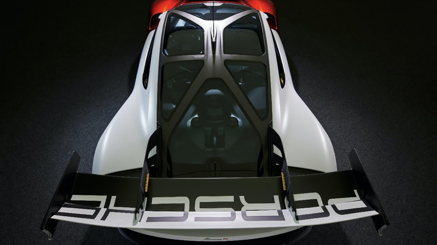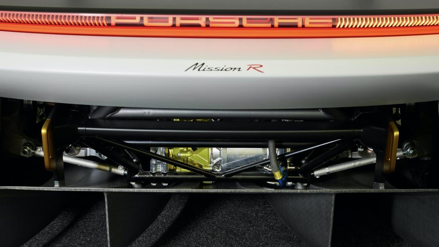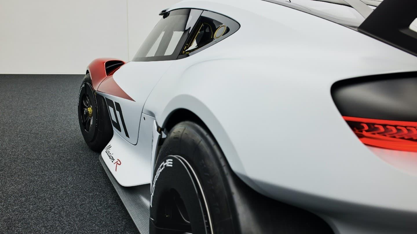En cuanto a la aerodinámica, Porsche ha incluido elementos activos como ya sucede en vehículos de calle como el Taycan, algo que no sólo implica en el ángulo de inclinación del spoiler trasero en el caso del Porsche Mission R, sino que también controlará las rejillas de las tomas de aire laterales en el frontal, incidiendo de esta forma en la cantidad de drag generado por dichos elementos que variarán su grado de apertura en función de las necesidades que tengan de refrigeración los motores eléctricos. Como ya se había optado en el Porsche 718 Cayman GT4 Clubsport, se ha optado por emplear fibras naturales en algunos paneles de la carrocería, en este caso como parte del ‘tejido’ que conforma el conocido como NFRP (Natural Fiber Reinforced Plastic Composites).
