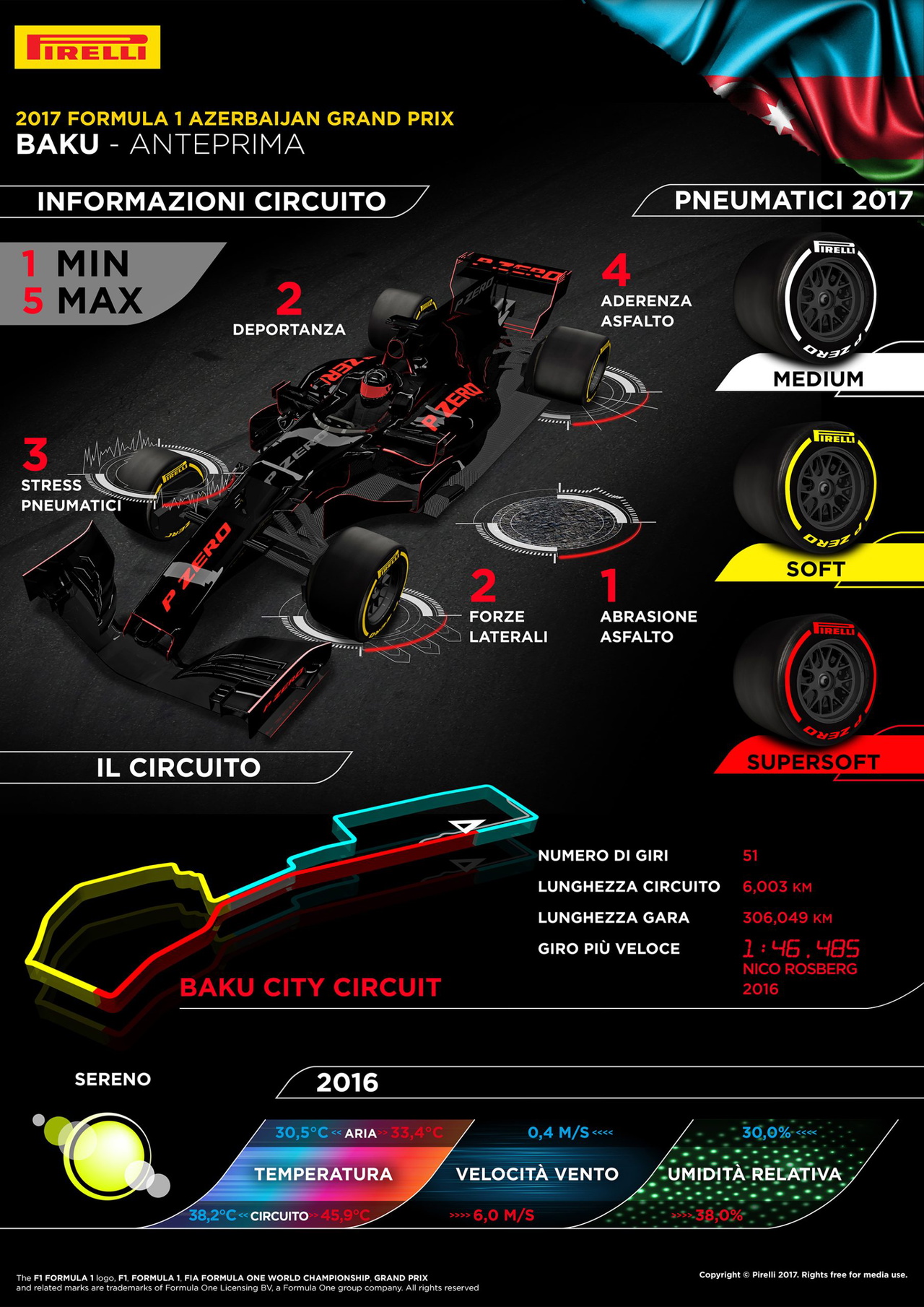 La ausencia del neumático ultrablando es el principal cambio que Pirelli ha introducido de cara a este fin de semana. Parece una elección sorprendente, ya que el trazado azerí no tuvo problemas de desgaste la pasada temporada y fue testigo de un evento generalmente estático a la espera de que algún piloto cometiese un error. Ferrari arregló una carrera irregular en Canadá con una estrategia a dos paradas que no ha sido habitual durante 2017, en una actuación que no espera repetirse gracias al posible uso del poco degradable neumático blando.