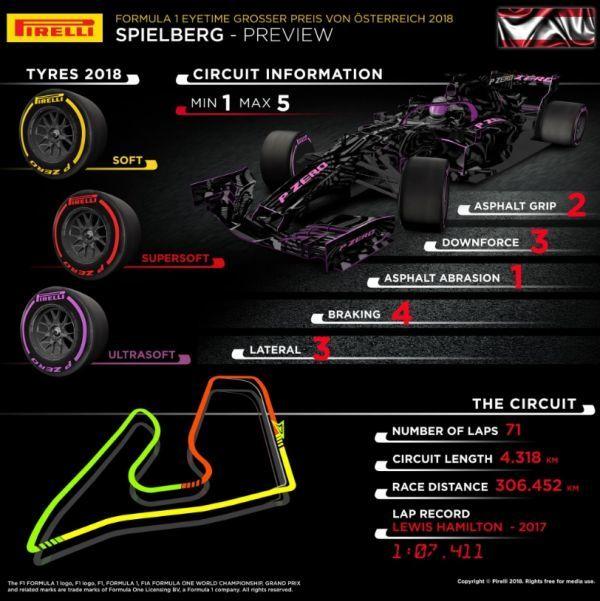 Desde la firma suministradora de neumáticos han decidido llevar la misma selección que a Francia que estaba formada por el compuesto, blando, superblando y ultrablando. El asfalto austriaco no es muy abrasivo, pero la peculiar configuración de la pista hace que los neumáticos sufran fuerzas laterales altas por lo que el desgaste puede ser bastante elevado.