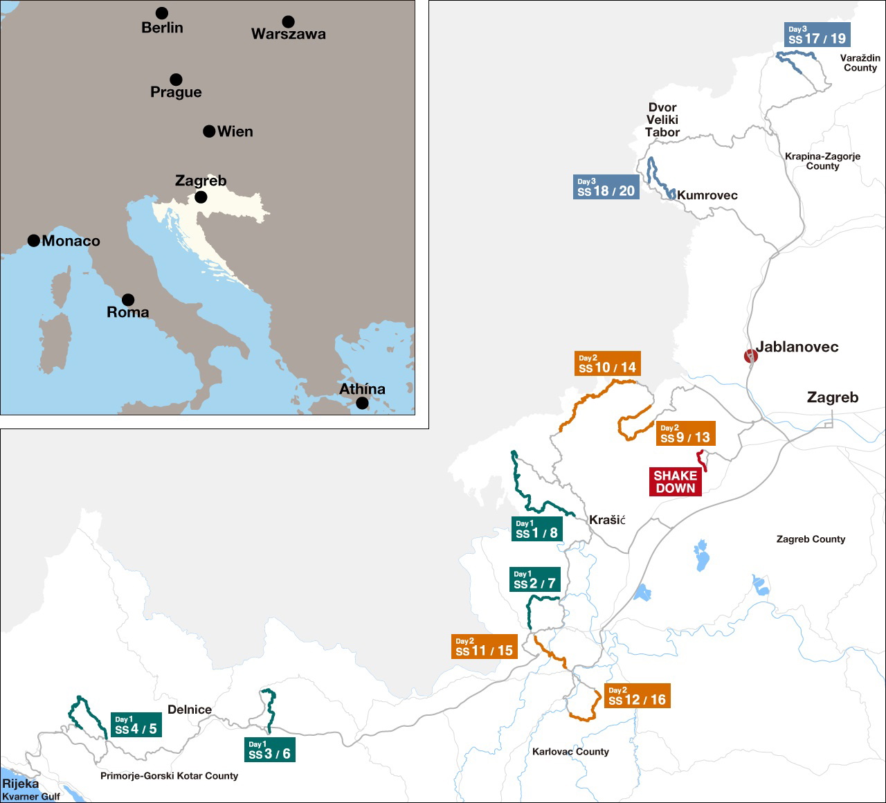Los tramos (20 especiales que suman entre todos ellos 283,28 kilómetros cronometrados) se desarrollan precisamente al norte del país, muy cerca de la frontera con Eslovenia, comenzando ya el jueves con un Shakedown previo a la salida ceremonial y sin la introducción de un tramo espectáculo esa tarde pasaremos a la etapa del viernes. Será la jornada más larga (119,74 km) con dos bucles de cuatro especiales situadas al suroeste de Zagreb, con reagrupamiento intermedio que simplemente se compondrá de un cambio de neumáticos, por lo que, sin asistencia, más de uno puede sufrir en caso de haber acumulado problemas mecánicos durante la mañana o algún error de conducción.