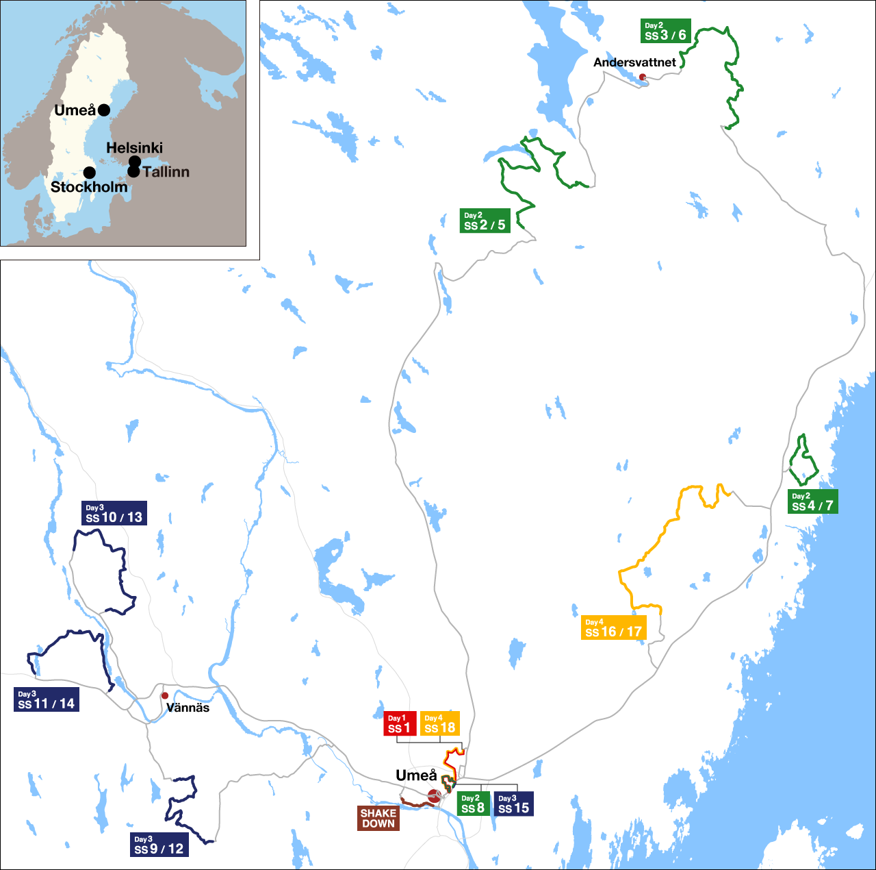 El evento comenzará con la acción en este caso el mismo jueves, con el shakedown programado por la mañana antes de la disputa de una especial por el recorrido completo de Umeå y sus 10,23 kilómetros competitivos. Ya el viernes, jornada con más kilometraje con 124,42 km competitivos, se desarrollarán dos bucles en los bosques de la zona noreste, con una asistencia convencional que dividirá la jornada en dos y terminando con un paso por la versión corta del Umeå Sprint. Ya el sábado se viajará hacia el oeste para seguir el mismo guion, doble pasada a tres tramos y segundo paso por la especial de poco más de cinco kilómetros.