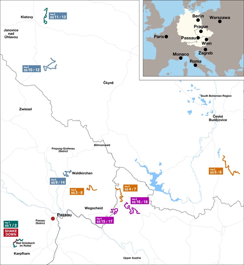 Indudablemente estamos frente a unas condiciones diametralmente distintas a las que los participantes se encontraron en el último evento sobre asfalto, el Rally Islas Canarias, e incluso se puede decir que hay diferencias grandes entre las especiales que se celebran en República Checa, Alemania y Austria por mucho que las especiales estén todas cerca de la triple frontera. Comenzaremos el jueves con dos pasadas por la especial en torno a Bad Griesbach, mientras que ya el viernes tendremos un tramo en cada uno de los países también a doble pasada.
