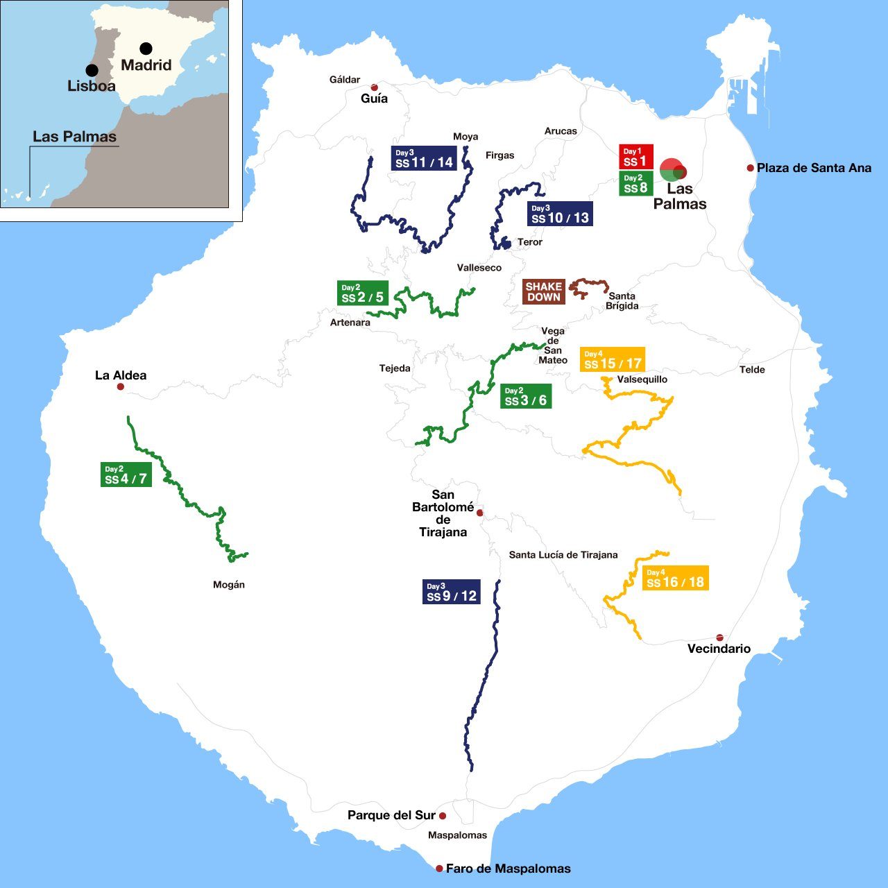 La edición de este año comenzará con el shakedown en la jornada del jueves, antes de dar paso a la primera pasada por la superespecial en el Estadio de Gran Canaria, ya el jueves por la noche. La etapa del viernes repetirá, aunque en este caso lo hará para poner el broche a un día conformado por dos bucles de tres tramos cada uno por las secciones de la mitad norte de la isla. El sábado también se visitará el sur, concretamente con el tramo meridional de Maspalomas (TC9/12), aunque repartido en este caso con dos especiales norteñas muy técnicas como Teror y Moya. Ya el domingo, dos tramos repetidos, al este de la isla y con mucho kilometraje para lo que nos acostumbra el Mundial, más de 78 km competitivos.
