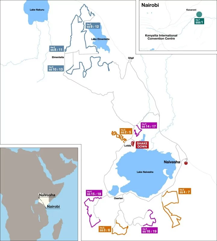 La prueba este año estará configurada con 19 especiales que entre todas ellas acumularán 367,76 kilómetros cronometrados, comenzando la acción ya este miércoles cuando se llevará a cabo el shakedown, programada la primera superespecial ya para el jueves, Kasarani, después de la salida ceremonial en Nairobi. A partir de ahí, el resto de la acción se centra en torno al Lago Naivasha, donde se establecerá a su vez el parque de asistencia, con un pequeño viaje el sábado al norte en torno al Lago Elmenteita.