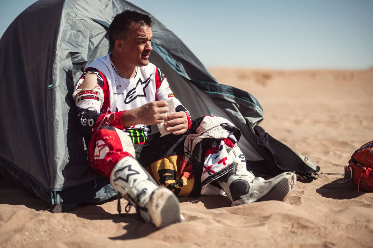 Parece una clavícula fracturada. Lo comprobamos en la gasolinera. Alrededor del km 140 me caí detrás de una duna, y Tosha casi hace lo mismo. Al levantarme, supe que tenía la clavícula rota, y también me dolía el esternón. Por desgracia, el rally se me escapó. Volveré con el equipo y decidiremos si puedo continuar con seguridad. Quiero seguir. He hecho 150 km en las dunas, que han ido bastante bien, así que debería poder controlar las secciones rocosas. Si todavía hubiera dunas, sería duro, pero ya no las tenemos y es más fácil en las pistas de tierra, quién sabe. No me rendiré. Mientras no me ordenen parar, seguiré en la carrera – Daniel Sanders
