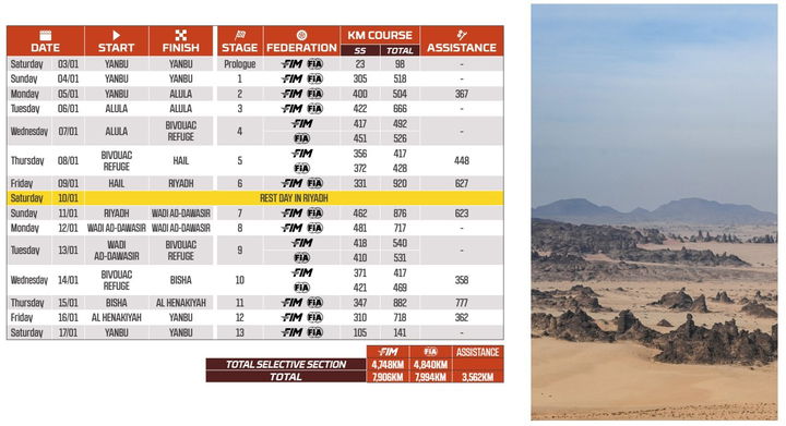 Los datos no parecen desde luego reflejar lo que gran parte de los protagonistas se esperan: con 2% representado por pequeñas secciones de asfalto, un 60% de tierra, un 25% de pistas de arena, un 7% de lo que la organización francesa establece como dunas y el 6% que viene marcado por caminos salpicados por piedras. La acción tendrá su pistoletazo de salida este sábado 3 de enero y esto es lo que se espera hasta el próximo 17 de enero.