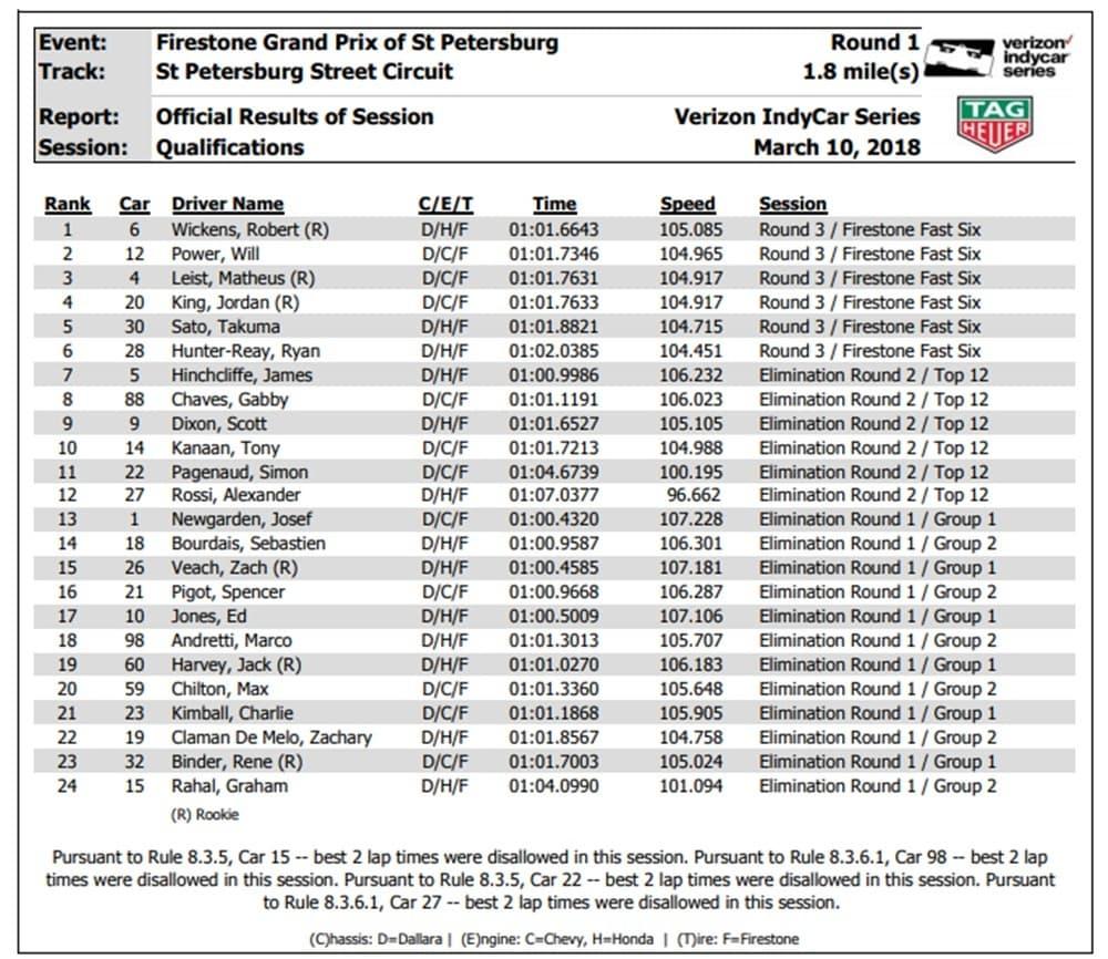Inicia el campeonato 2018 de la IndyCar con el debut soñado para el canadiense Robert Wickens, quien logró la pole en su primera participación. En una pista húmeda tras una ligera lluvia antes de iniciar la sesión clasificatoria, el piloto de Schmidt Peterson Motorsports Honda derrotó al experimentado Will Power y reeditó la hazaña de Sebastien Bourdais en 2003 cuando logró hacerse con la pole en su primera carrera en la categoría. Matheus «Matt» Leist y Jordan King, también debutantes, saldrán tercero y cuarto respectivamente.