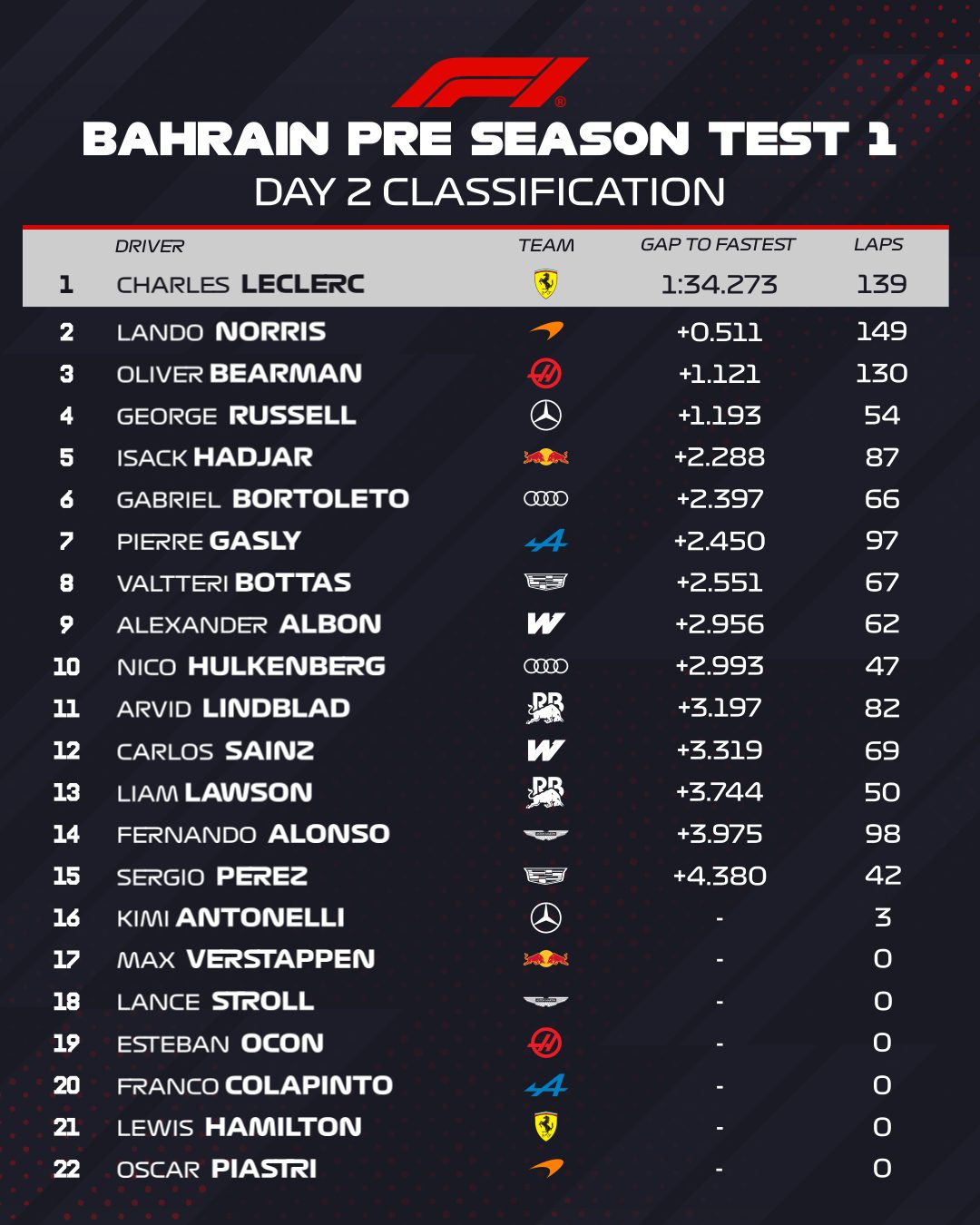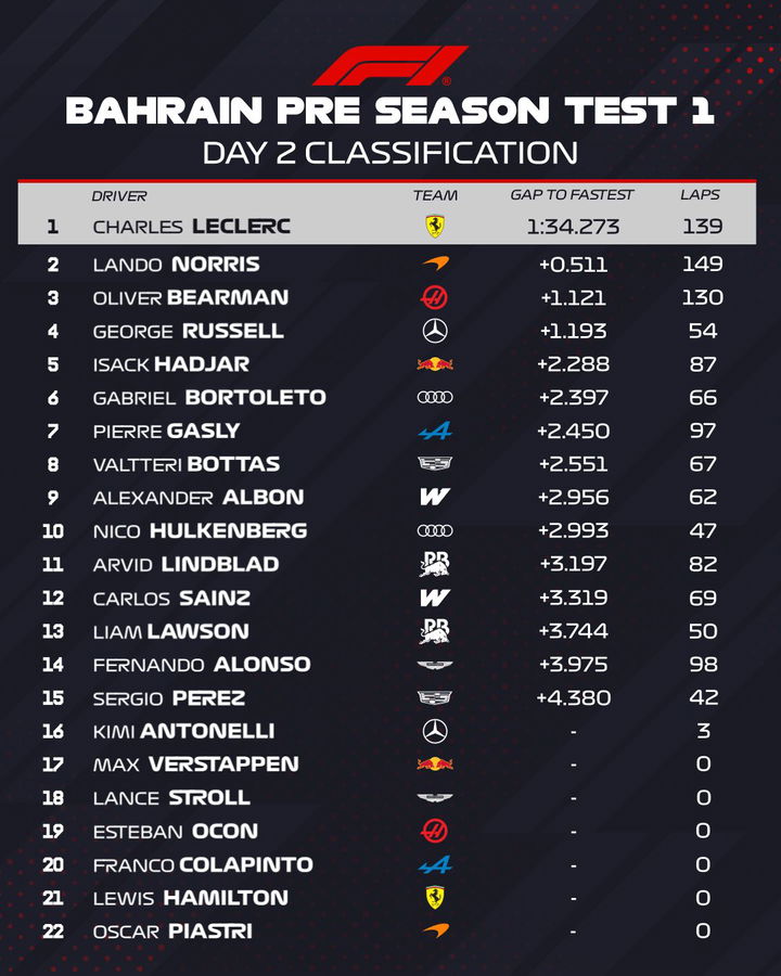 También en Red Bull completaron menos kilometraje del deseado ya que Isack Hadjar sólo pudo hacer un giro por la mañana y fue por la tarde cuando aumentó su cuenta lo máximo posible hasta llegar a las 87. El francés, que llegaba a la escudería con sede en Milton Keynes para reemplazar a Yuki Tsunoda, ha conseguido aun así acabar con el quinto mejor crono, eso sí, a más de dos segundos de Leclerc y justo por delante de Gabriele Bortoleto.