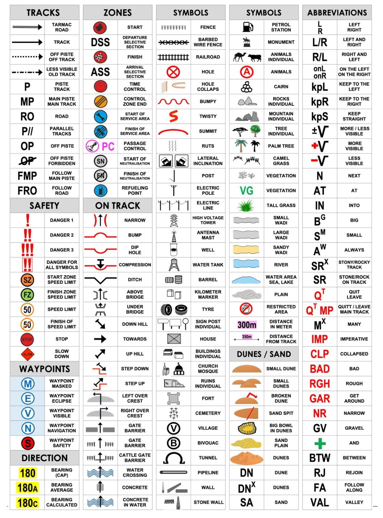 A partir de este punto podemos distinguir los múltiples tipos de referencias que se utilizan para que los copilotos puedan guiarse, comenzando por el tipo de flecha para distinguir el tipo de carretera o pista por la que se circula, además de la dirección del CAP (rumbo, los grados de ángulo hacia los que se encuentra el siguiente punto de paso entre 0 y 360º), tipos de arena, elementos visuales como pueblos, postes eléctricos rocas o palmeras, así como abreviaturas para que, a falta de notas específicas, los pilotos sepan más o menos lo que hay detrás de una curva o de un rasante y así no llevarse sustos.