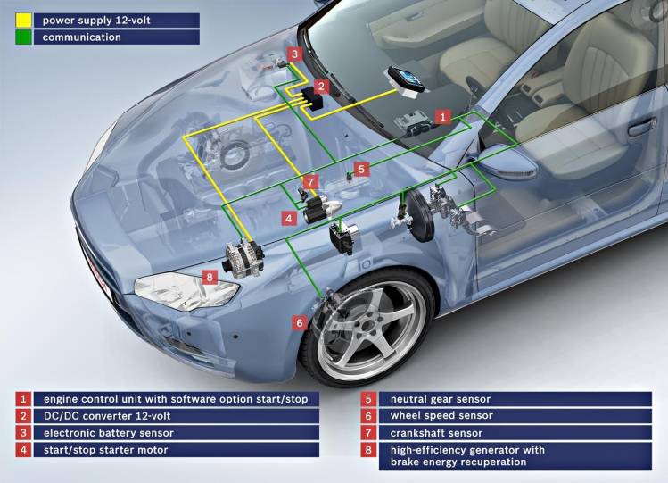 La arquitectura habitual del sistema Start/Stop se compone de un motor de arranque "reforzado", una batería más capaz y un motor de combustión interna optimizado para no verse penalizado en lubricación y refrigeración por continuos sucesos de parada y arranque. Con el paso del tiempo, los sistemas Start/Stop han conocido diferentes variantes, como los alternadores reversibles o los sistemas de carga paralela mediante condensadores para aliviar a la baterías principal del trabajo continuado de carga y descarga.