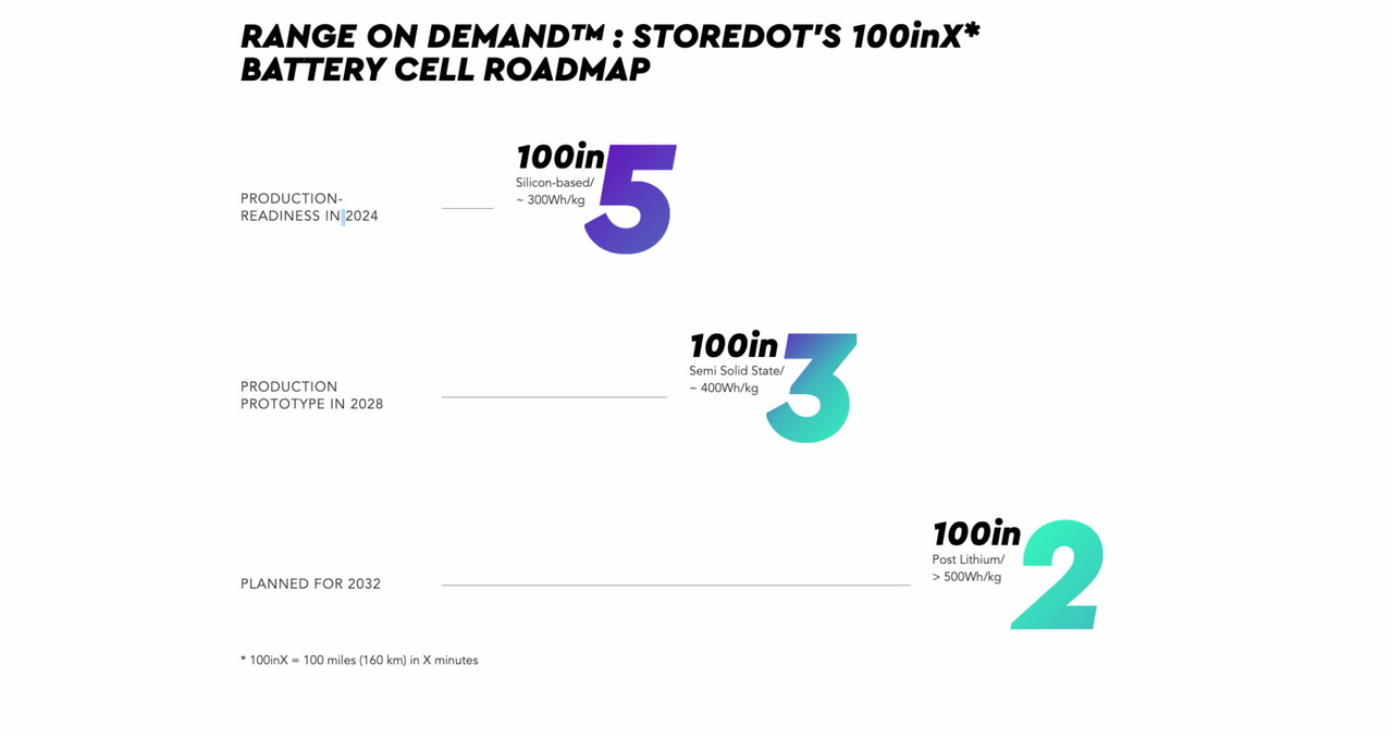 El objetivo de StoreDot es comenzar la producción en grandes volúmenes de sus celdas de batería con ánodo de silicio el año que viene. Las baterías que emplearán estas celdas permitirán recargar 160 kilómetros de autonomía en solo 5 minutos. En 5 años, StoreDot espera disponer de celdas de batería de estado semi-sólido, que recargarían 160 kilómetros de autonomía en 3 minutos.