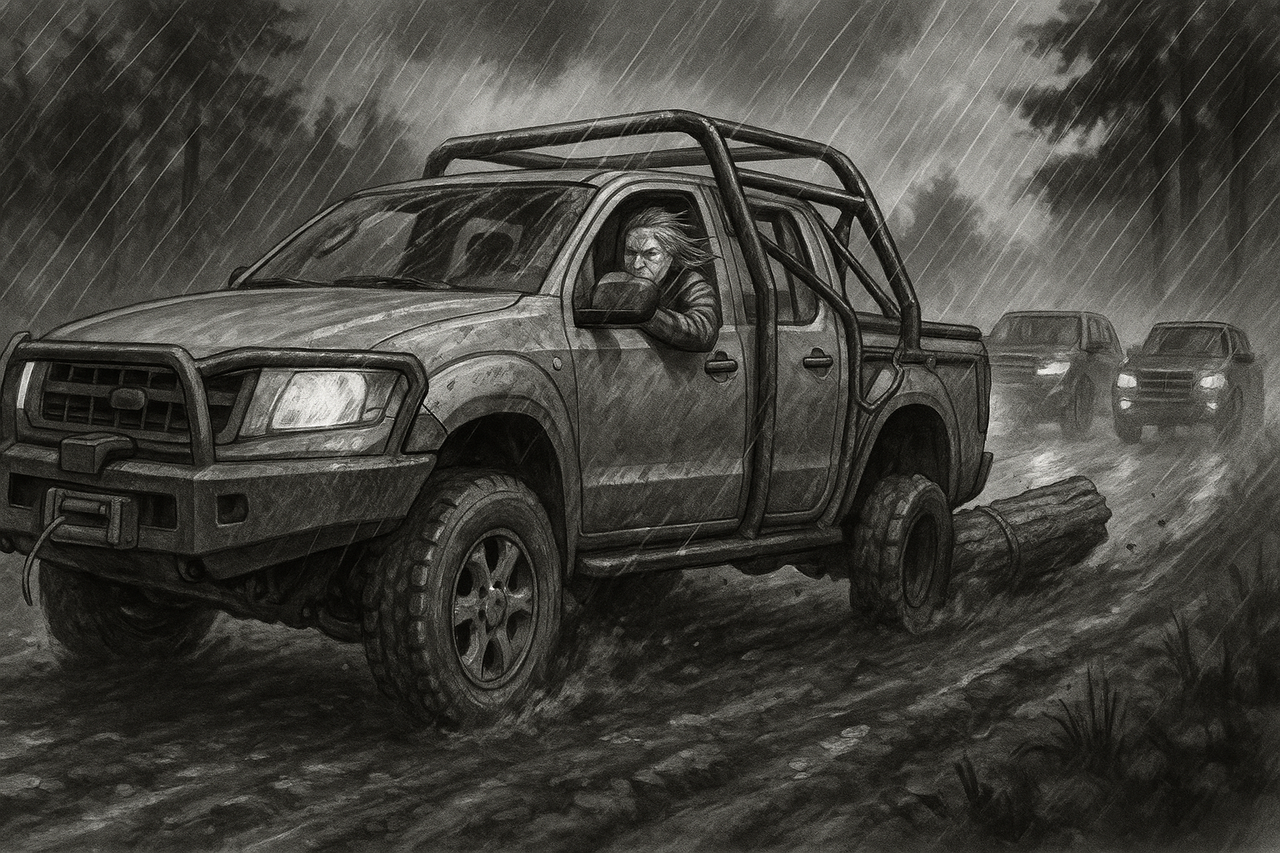 Los tipos alumbran con linternas en su dirección al escuchar el motor, pero ya es tarde. La Ford Ranger pasa entre ellos a toda velocidad con un tronco por rueda.
