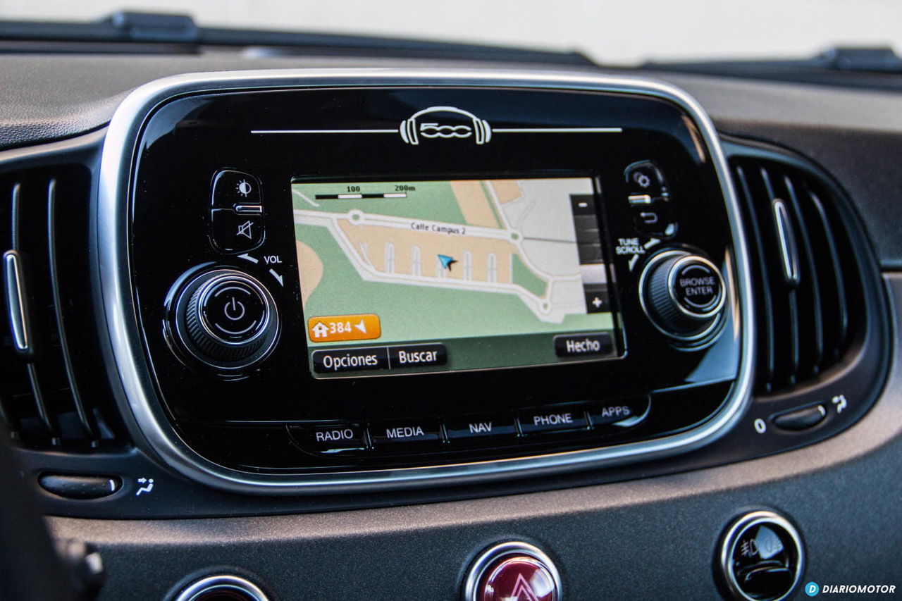 Abarth 595 Competizione 2016. El sistema de infoentretenimiento Uconnect sustituye al antediluviano Blue&Me, desfasado y poco intuitivo. Todo se maneja a través de una sencilla pantalla táctil de cinco pulgadas. Dispone de servicios con conexión a Internet, navegador, streaming de audio por Bluetooth… lo esperado en un coche moderno.