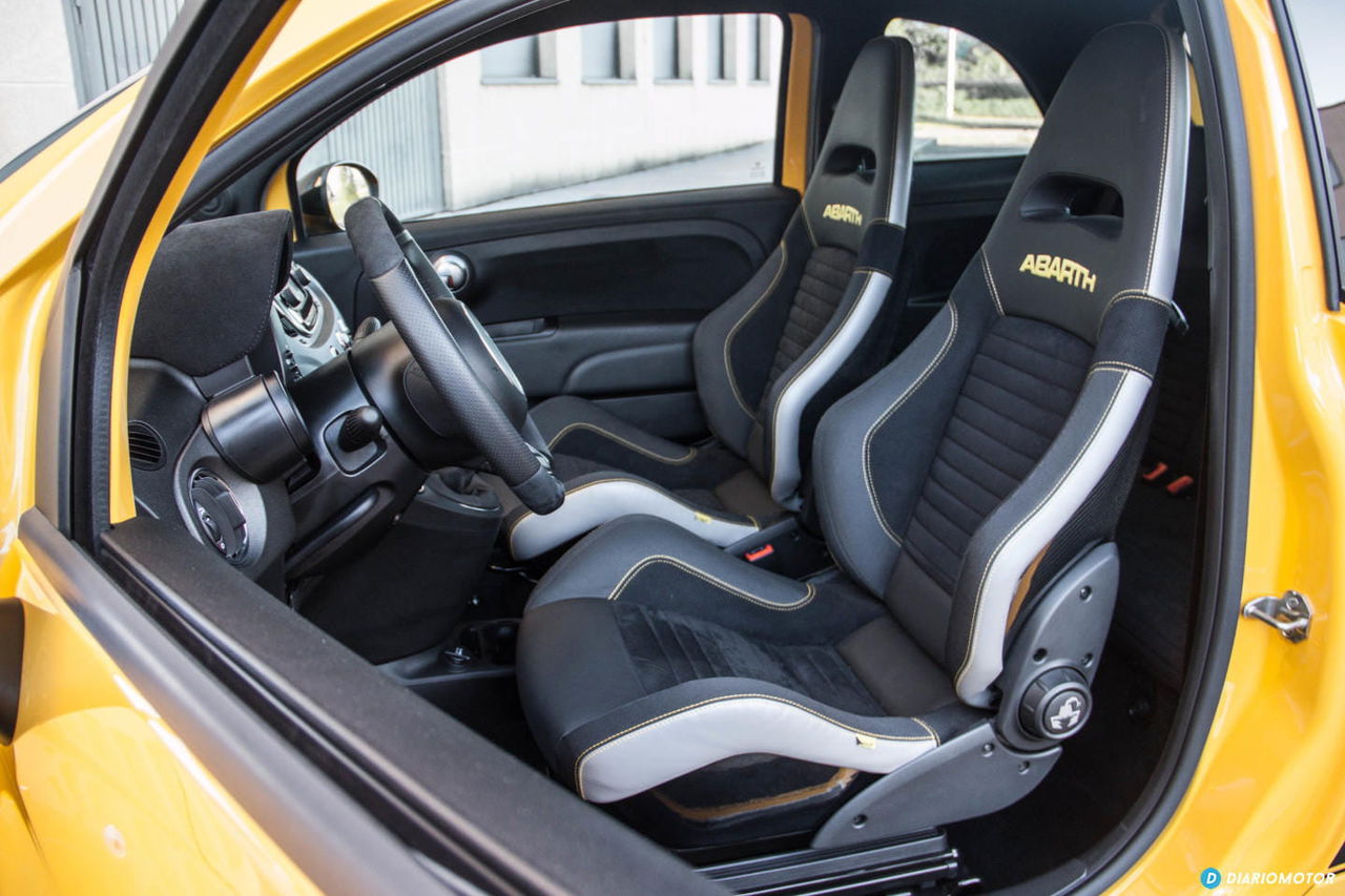 Abarth 595 Competizione 2016. Los bácquets Sábelt son idénticos. Sí es diferente su tapizado, con Alcantara perforada y colores más modernos. También ha cambiado el bordado del respaldo.