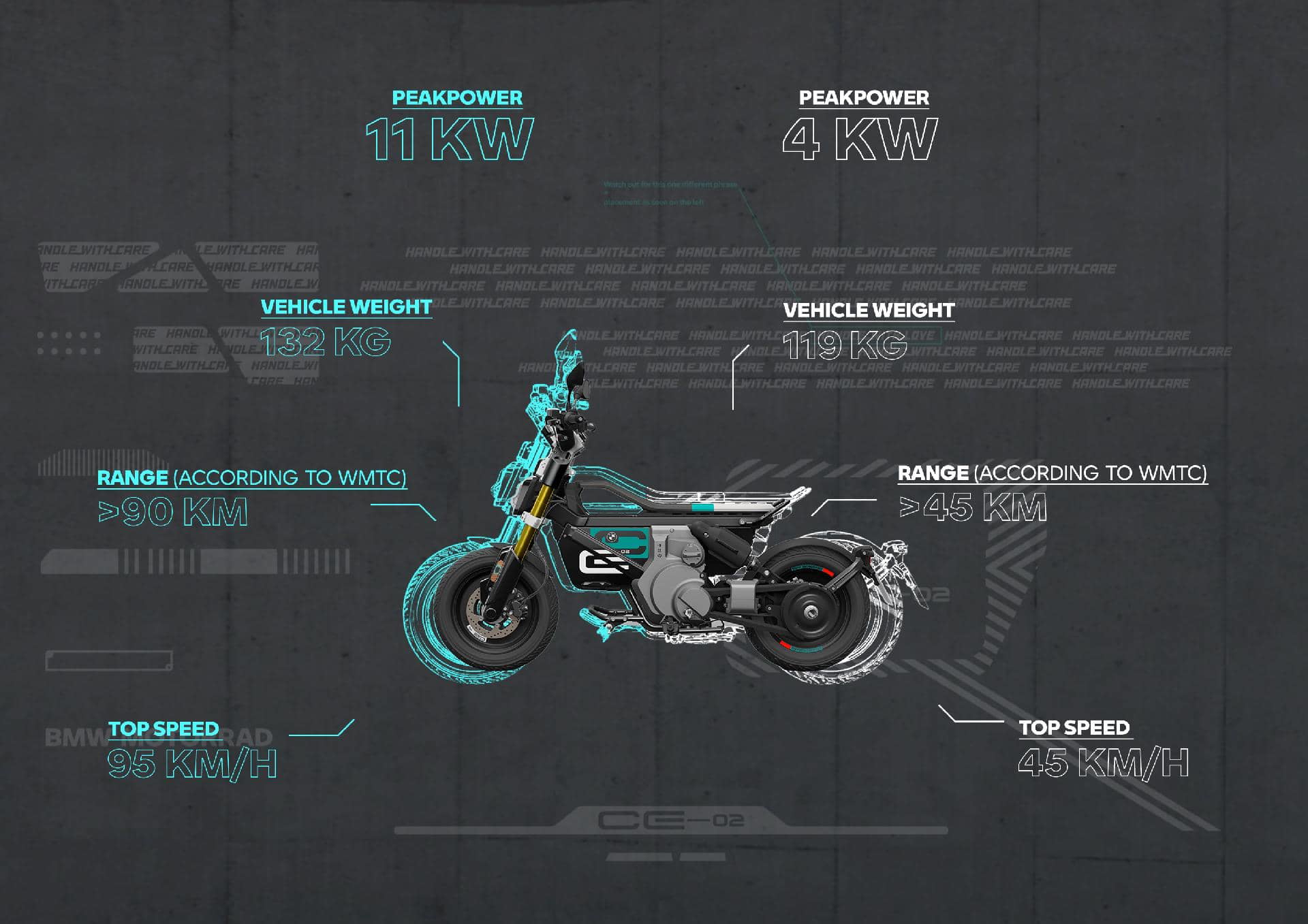 Para tratarse de una eléctrica, la BMW CE 02 no es excesivamente pesada, marcando 135 kilogramos en báscula en su versión 11 kW y 119 kilogramos en la versión 4 kW, diferencia se debe, sobre todo, al hecho de que esta última utilice un pack de baterías más compacto.