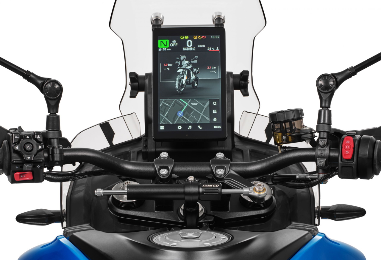 Toda la información se visualiza en una pantalla TFT táctil de 8 pulgadas, desde la que se gestionan los parámetros de la moto, la conectividad y las actualizaciones OTA. A ello se suman elementos prácticos pensados para el viaje y la aventura, como tomas USB tipo A y C, control de crucero, puños y asiento calefactables, sensor de presión de neumáticos y un equipamiento de protección de serie que incluye cubrecárter, paramanos y estriberas desmontables.