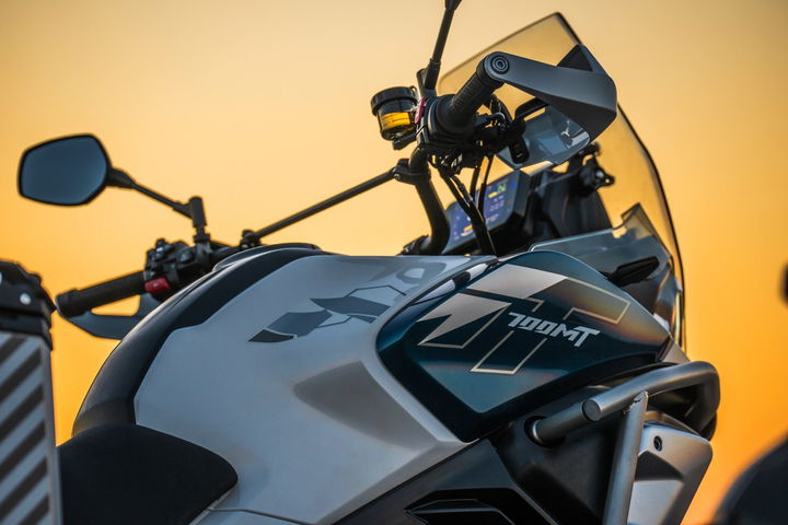 La CFMOTO 700MT se sitúa en el territorio de las aventureras que llenan visualmente y también en la práctica: una carrocería generosa, postura erguida y un enfoque claro hacia la ruta, con una propuesta aventurera para rutas todoterreno ligeras y casuales, y una mayor orientación de asfalto, que CFMOTO ha tenido a bien diferenciar por los códigos MT – un 80% de carretera y el 20% restante de todoterreno – y MT-X – un 60% de carretera y un 40% de todoterreno.