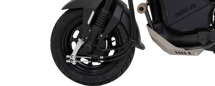 Si queremos un vehículo barato, sencillez es lo que debemos esperar. Como suele pasar con estas motos compactas, tenemos unas ruedas enanas de 12″ y 10″ con frenos de tambor de 130mm. Encontramos horquilla convencional delante y basculante tradicional detrás.
