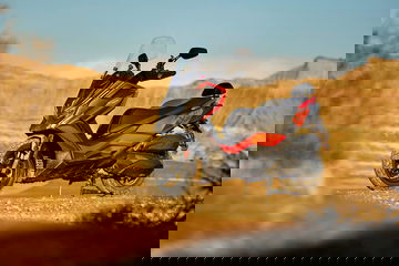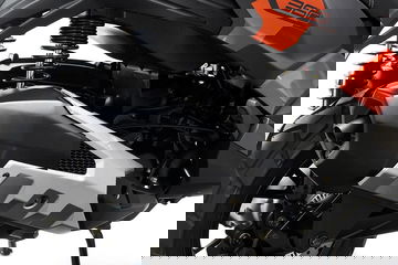 Pero la clave diferencial de esta moto reside en una configuración de neumáticos y suspensiones optimizada para salir del asfalto, por rutas sin asfaltar y senderos rotos. En el basculante, un grupo moto propulsor oscilante con doble amortiguador hidráulico con 100 milímetros de recorrido y precarga ajustable en 5 posiciones, para absorber las irregularidades del terreno, así como una horquilla telescópica hidráulica de 37 milímetros de diámetro y 110 milímetro de recorrido.