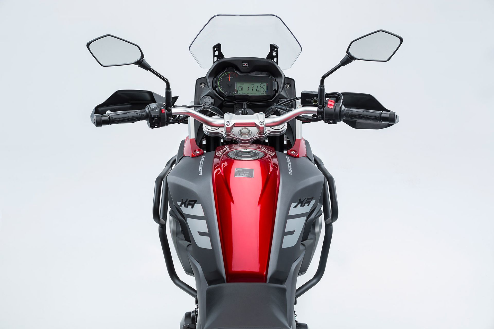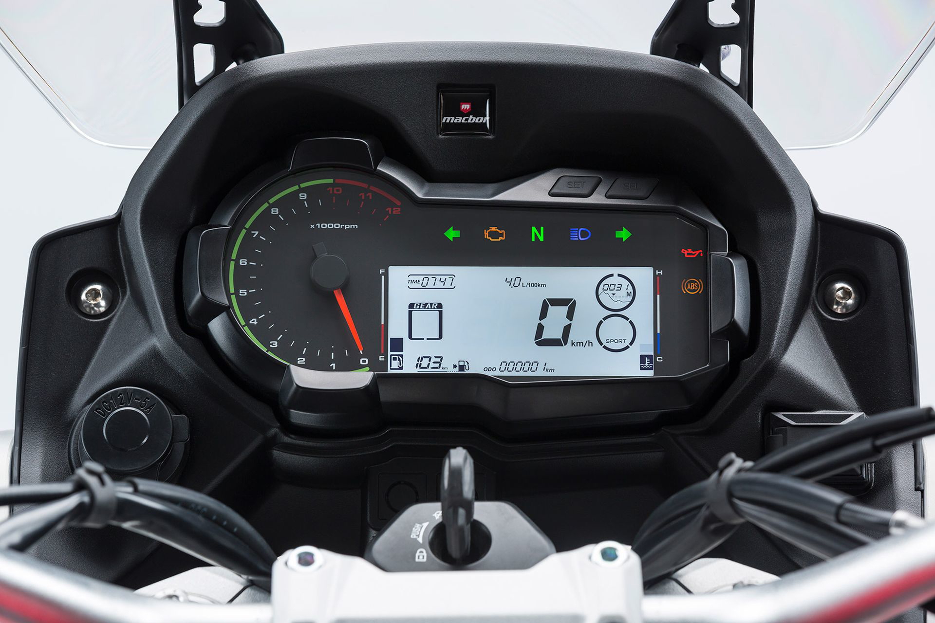 • La Macbor Montana XR5 tiene iluminación LED, tanto en ópticas como pilotos. La instrumentación combina un cuentavueltas analógico con una pantalla LCD retroiluminada, que ofrece mucha información, tanto de la moto como de datos de viaje.